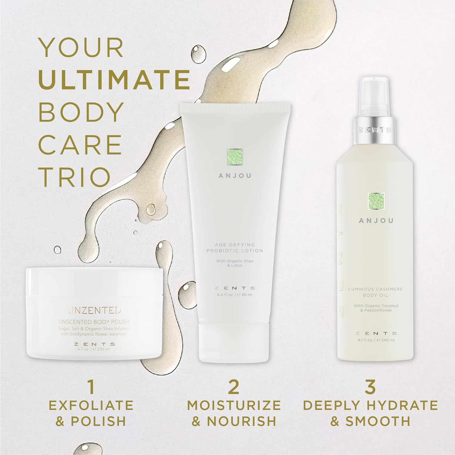 Zents Luminous Cashmere Body Oil (Anjou Fragrance) | Moisturizing Body Oil with Vitamin E & Organic Coconut Oil | Softens & Smooths Skin | 8 fl oz