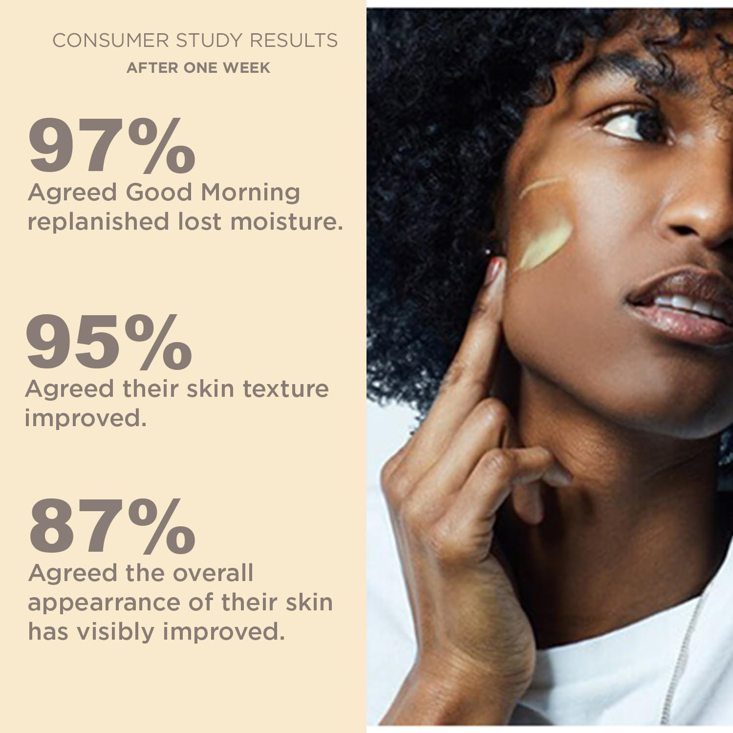 • CONSUMER STUDY RESULT: After a once-a-day usage for 7 days: 97% Agreed Good Morning replenished lost moisture. 95% Agreed their skin texture and visible fine lines improved. 87% Agreed the overall appearance of their skin has visibly improved.