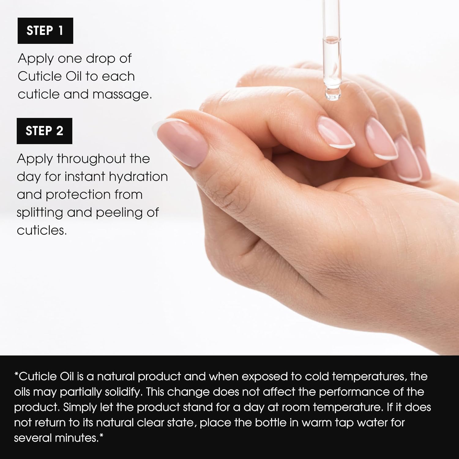 • EASY TO USE: Apply one drop of Cuticle Oil to each cuticle and massage. Apply throughout the day for instant hydration and protection from splitting and peeling of cuticles.