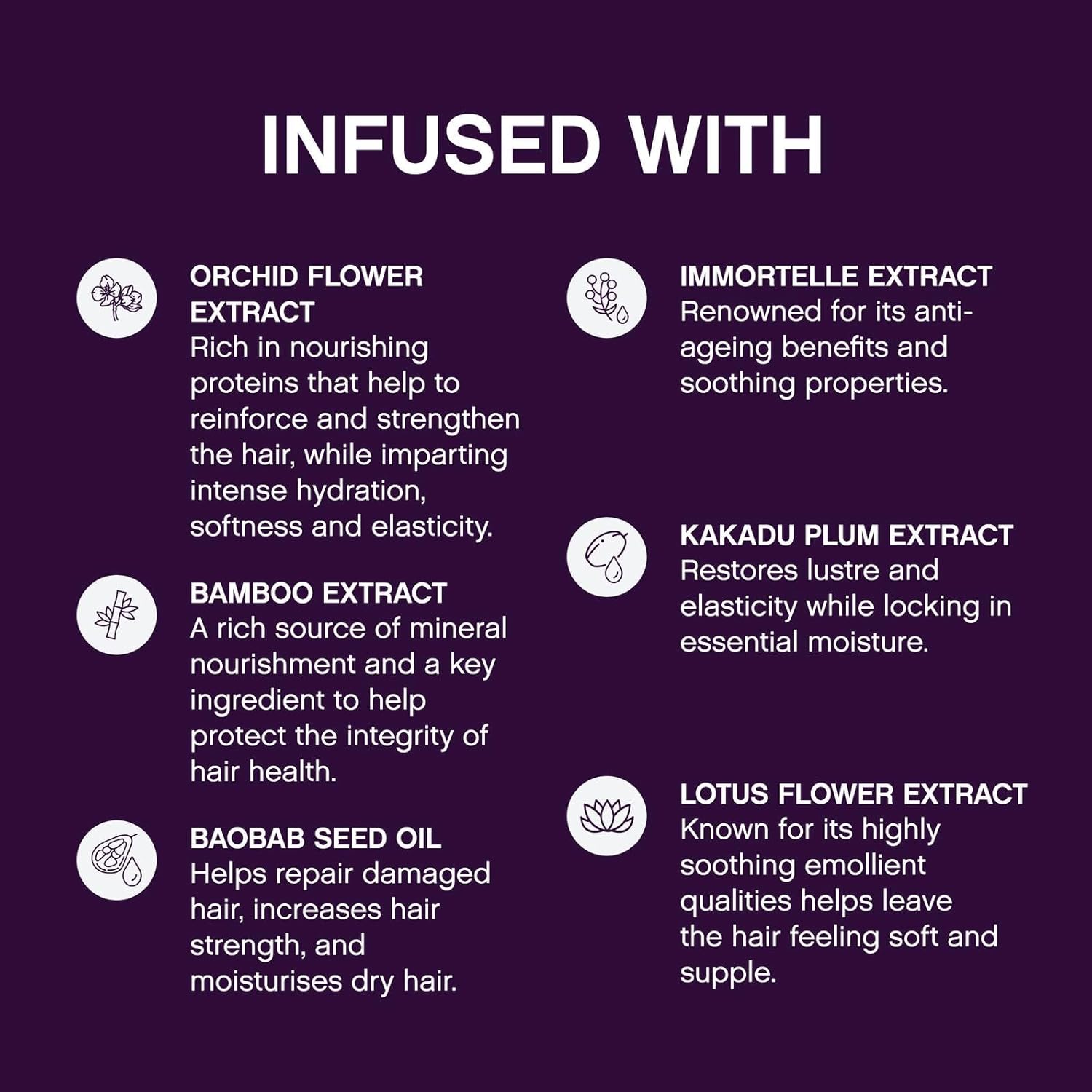• Hair Hydration Ingredients: Formulated with Amino Acids, Baobab Seed Oil, and Orchid Flower Extract, this hair treatment strengthens, softens, and restores ageing hair