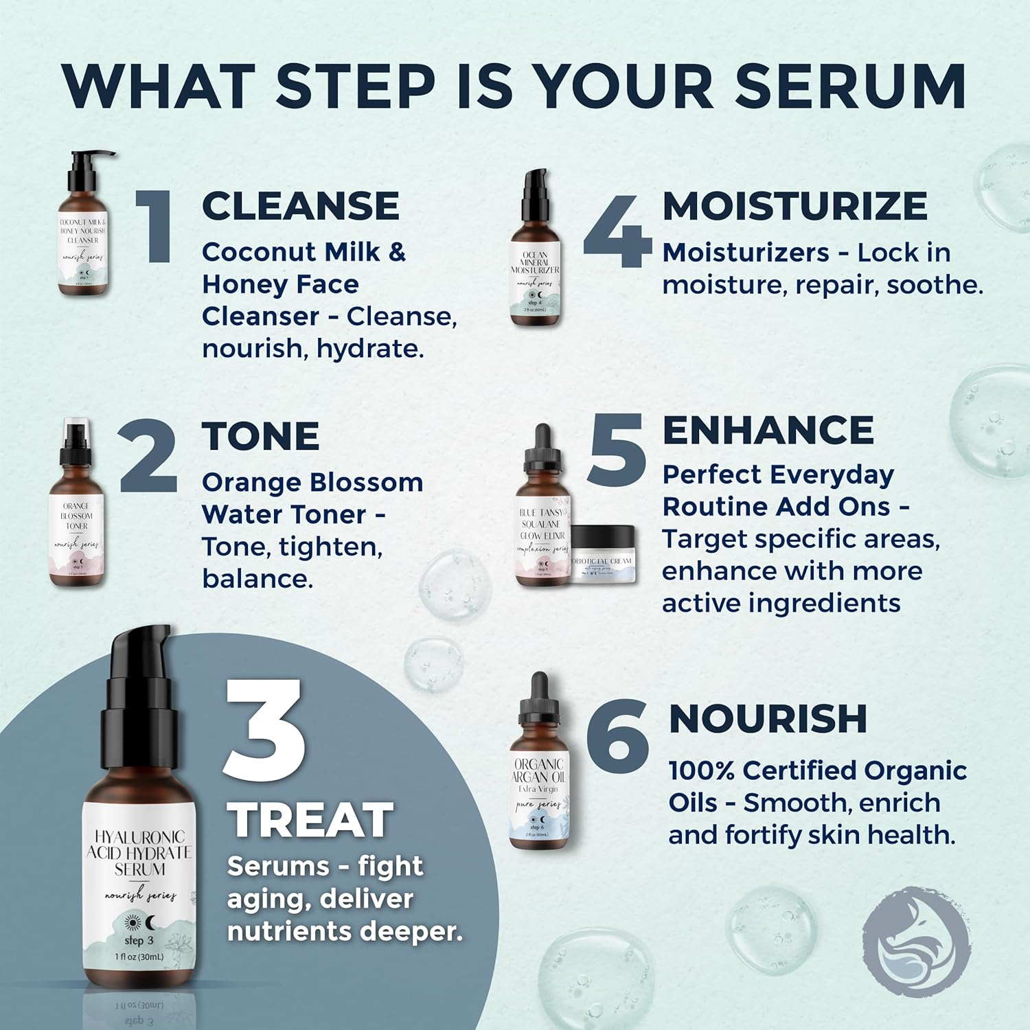 • MADE IN USA FOR ALL SKIN TYPES - Our Hyaluronic Acid Serum is fully Vegan, Cruelty-Free, never tested on animals and bottled in USA only in small batches. Does not contain any kind of additives such as parabens, alcohols, sulfates, artificial scents, phthalates, dyes, and talc. Suitable for all skin types, including sensitive, oily, dry, and combination skin