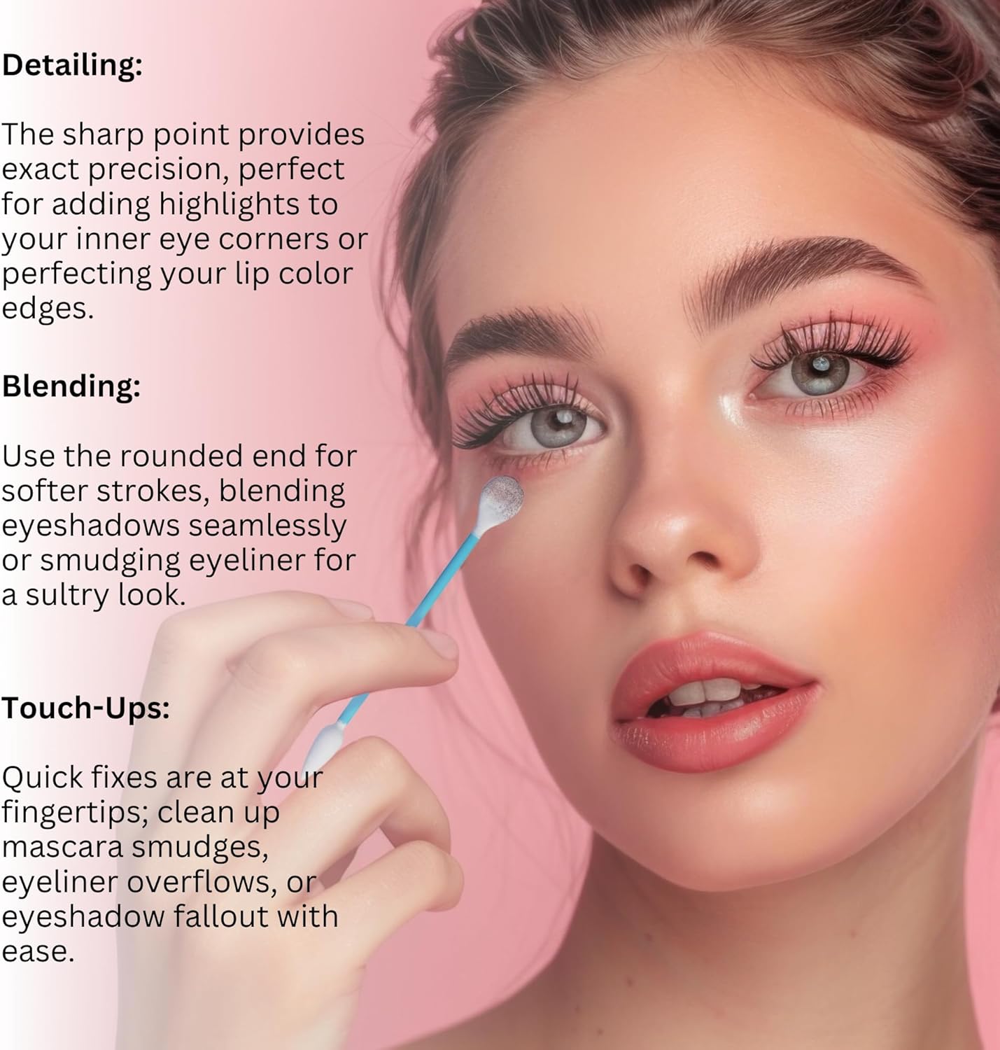 • PRECISION MAKEUP APPLICATOR - soft, double-sided cotton swabs pointed at one end, rounded at the other, for precision application, perfect blending and gentle, effective cleaning.