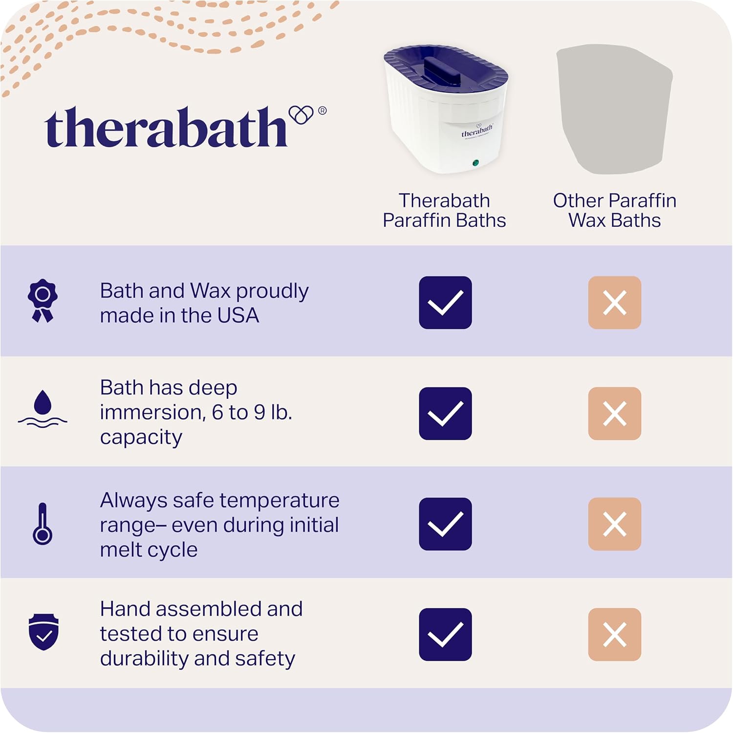 • The Comfort You Deserve. You deserve the best therapy options available when managing discomfort. As a form of thermotherapy, Therabath paraffin wax treatments are clinically proven as a treatment for arthritis but are also used to moisturize skin and provide warming comfort. Therabath aims to support you on your journey to relief with uncompromising commitment to quality and safety.