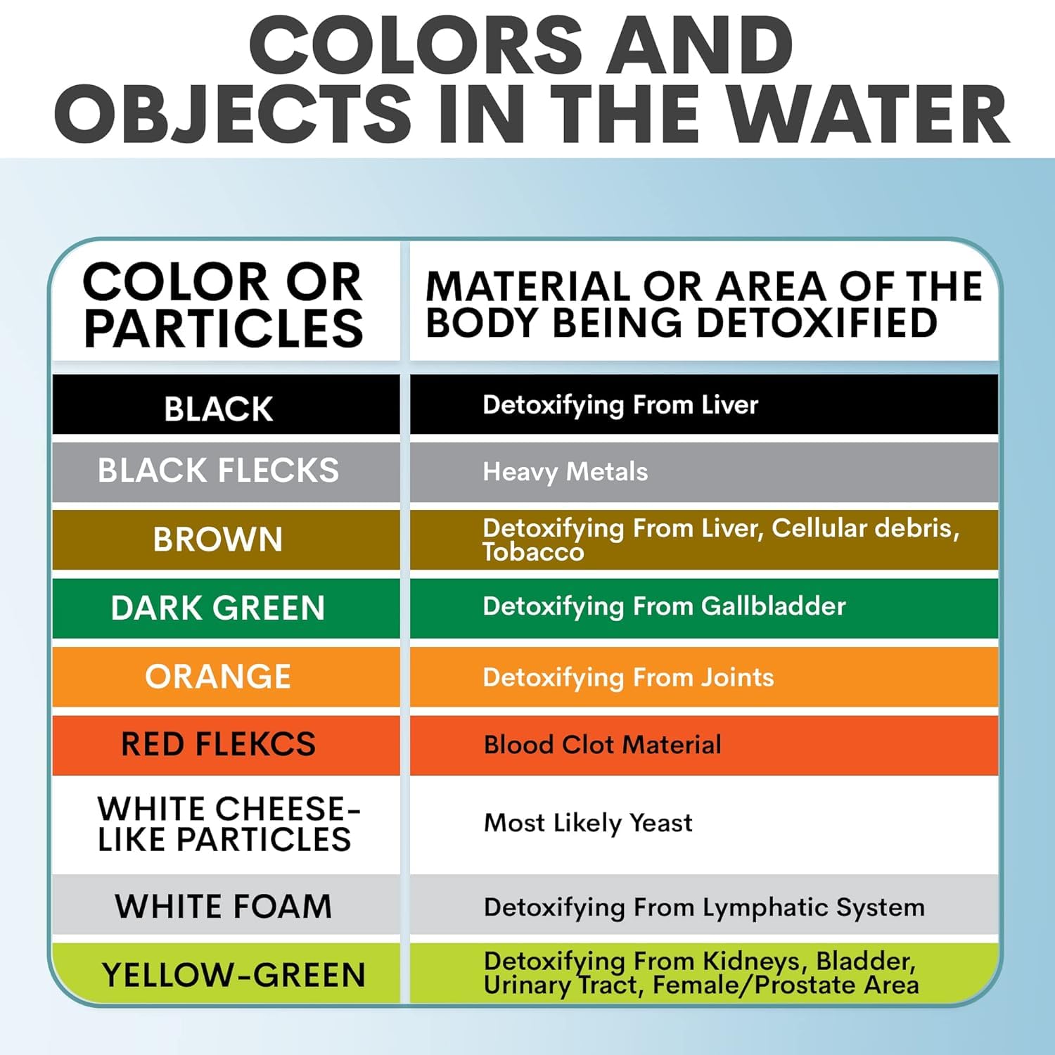 • WHAT’S IN THE BOX - This ionic detox foot bath machine comes with everything you need to enjoy a relaxing and cleansing foot bath at home. You will get a controller unit, a 1/4 lb. bag of Detox Sea Salt, two reusable arrays, a white 12QT basin, an instruction manual, an ionic detox foot bath brochure, and a 16-page informational booklet.