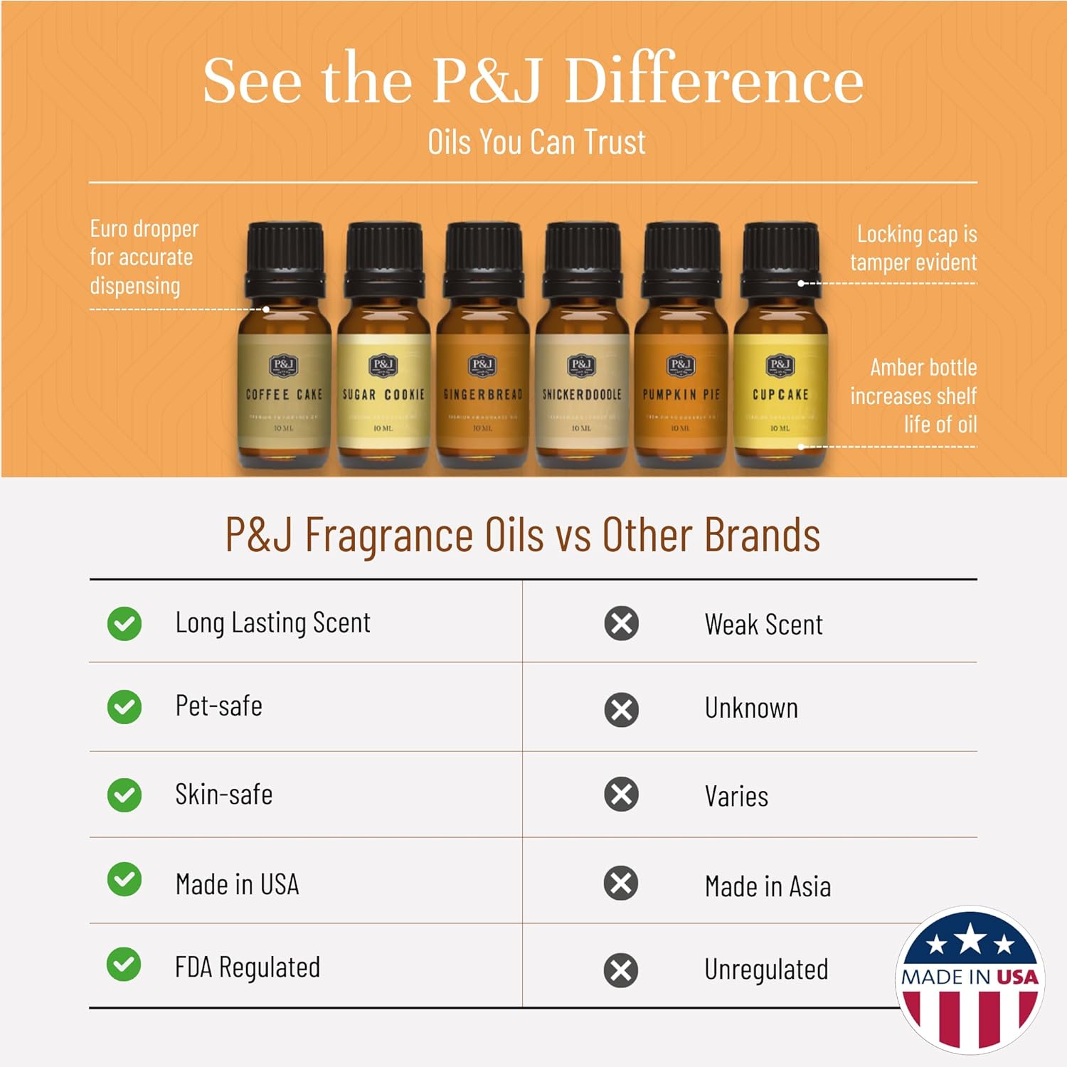 • Premium Grade: P&J fragrances oils are highly concentrated with a strong scent. With more than 30 years in the industry, these enhanced formulations were developed by our IFRA certified master perfumers. Our oils are safe and ideal for every home.