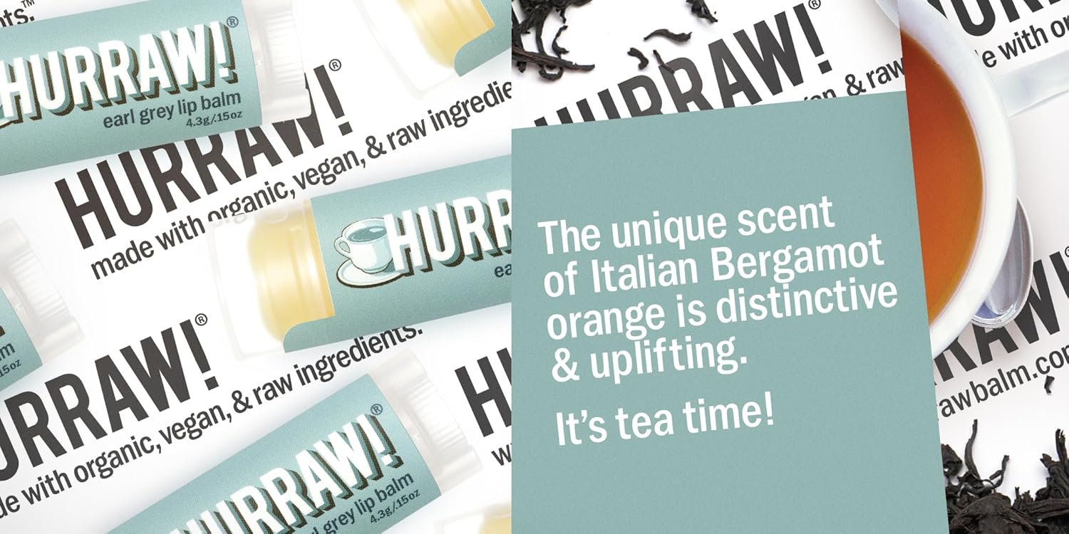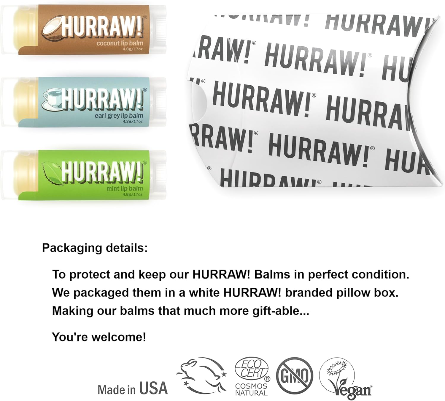• THREE 4.8g/.17oz Oval Tubes of HURRAW! Lip Balm packaged in a white HURRAW! branded pillow box. COCONUT Balm (Raw Coconut Oil…. Not too beachy, a little toasty... coconut perfection), EARL GREY Balm (You'll be 'loving tea' all day long), MINT Balm (long lasting minty treat for your lips!). Made with certified organic, vegan, and raw ingredients. Hurraw! Lip Balms are certified 100% all natural origin, cruelty and gluten free. Non-GMO. Bee, Shea, Soy and Palm Free.