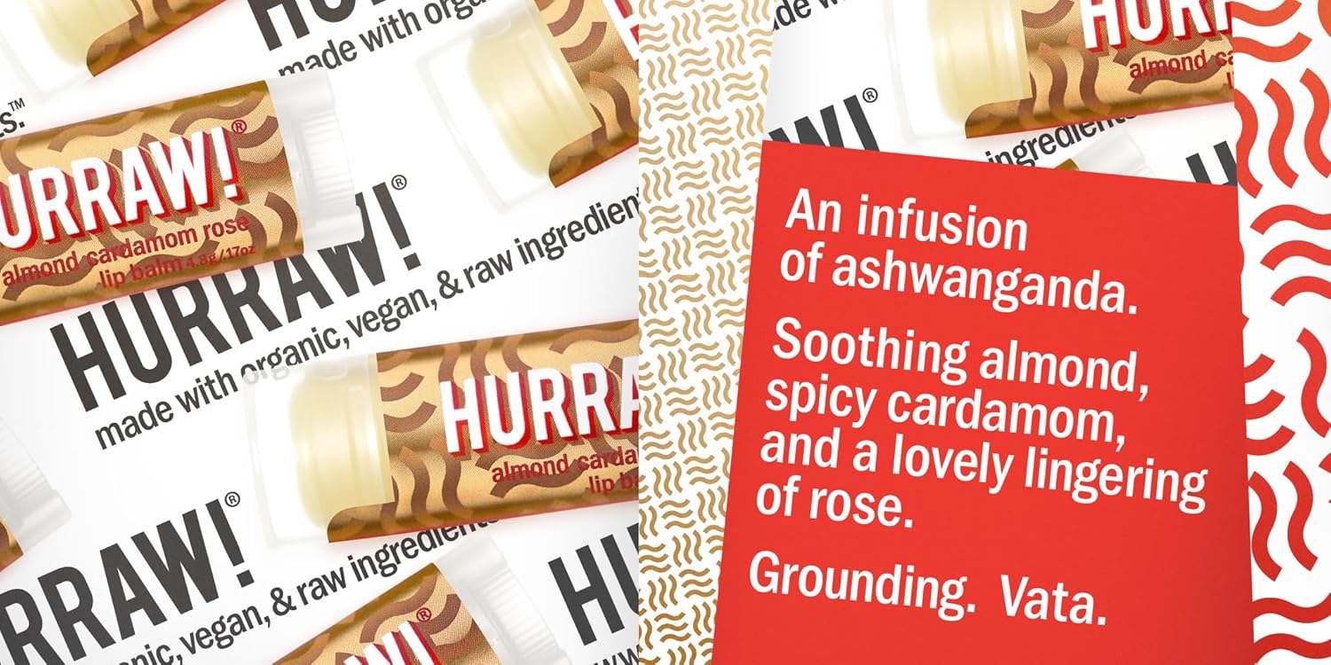 • THREE 4.8g/.17oz Oval Tubes packaged in a white HURRAW! branded pillow box. PITTA (Coconut, Mint, Lemongrass), KAPHA (Grapefruit, Ginger, Eucalyptus), VATA (Almond, Cardamom, Rose). Made with certified organic, vegan, and raw ingredients. Hurraw! Lip Balms are certified 100% all natural origin, cruelty and gluten free. Non-GMO. Bee, Shea, Soy and Palm Free.