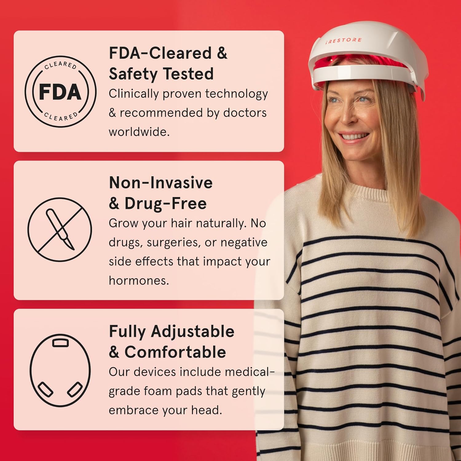 • iRestore Laser Hair Growth System is an FDA-cleared hair loss treatment and laser hair growth device for treating alopecia, receding hairline, balding and thinning hair to stimulate hair growth for women and men.