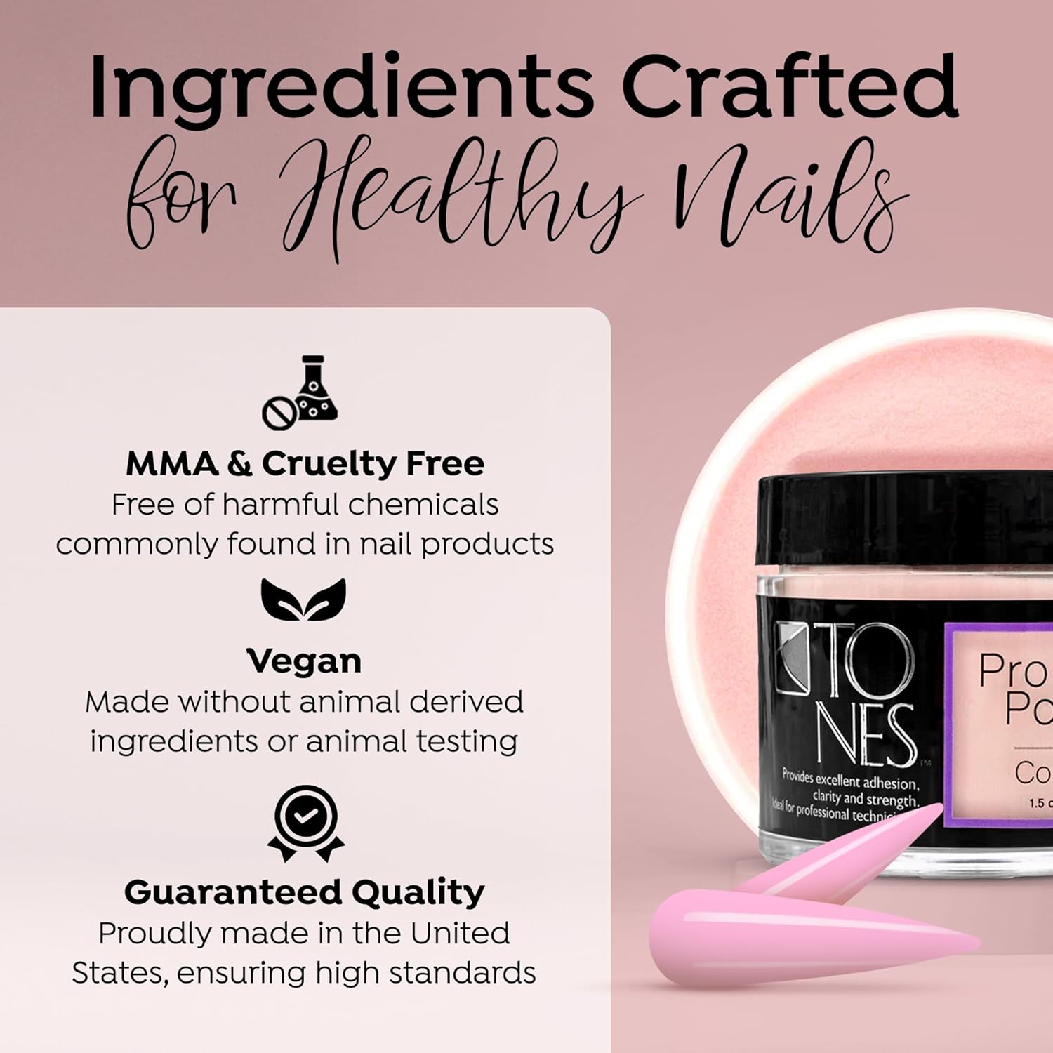 • THE TONES PROMISE: MADE IN THE USA: Trust in a brand that cares. Tones is a family-owned, women-run business proudly crafting professional-grade nail supplies in the USA. We are committed to ethical practices and premium, cruelty-free ingredients, so you can purchase with confidence.