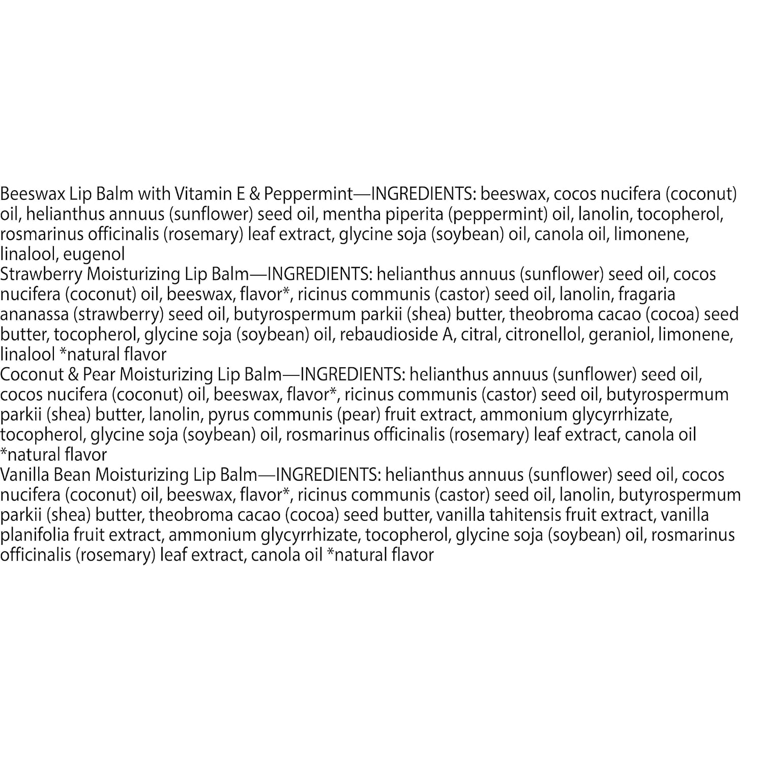 • FOUR REFRESHING FLAVORS: Delight the senses with Beeswax, Strawberry, Coconut and Pear, and Vanilla Bean flavors that will encourage you to apply flavored lip balm over and over again