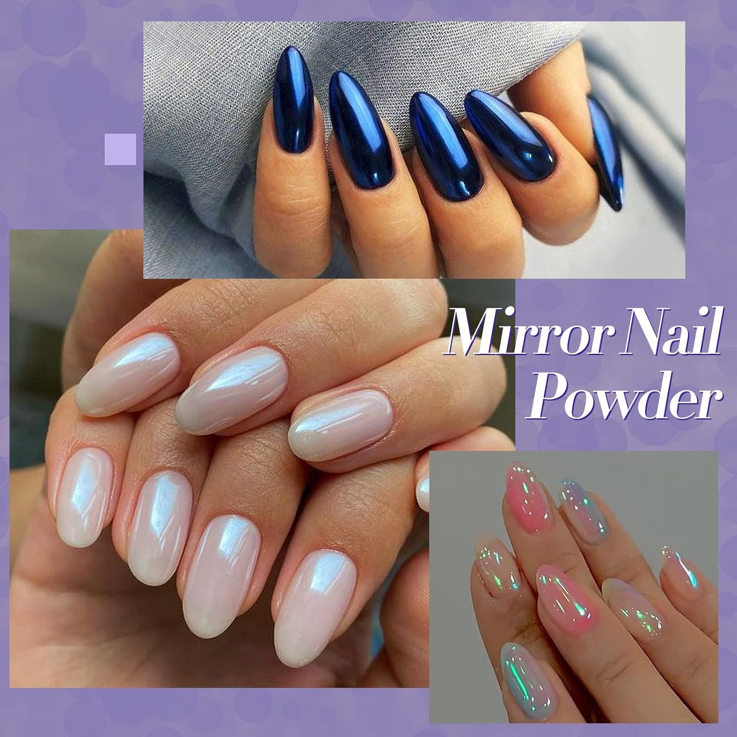 • WIDE APPLICATION: The colorful mirror nail powder is suitable to be applied on UV gel nails, acrylic nails, natural nails etc, a helpful DIY tool for nail art design. Different polish will give different actual effect.Trying different polish can also bring more fun to you with the chameleon powder.