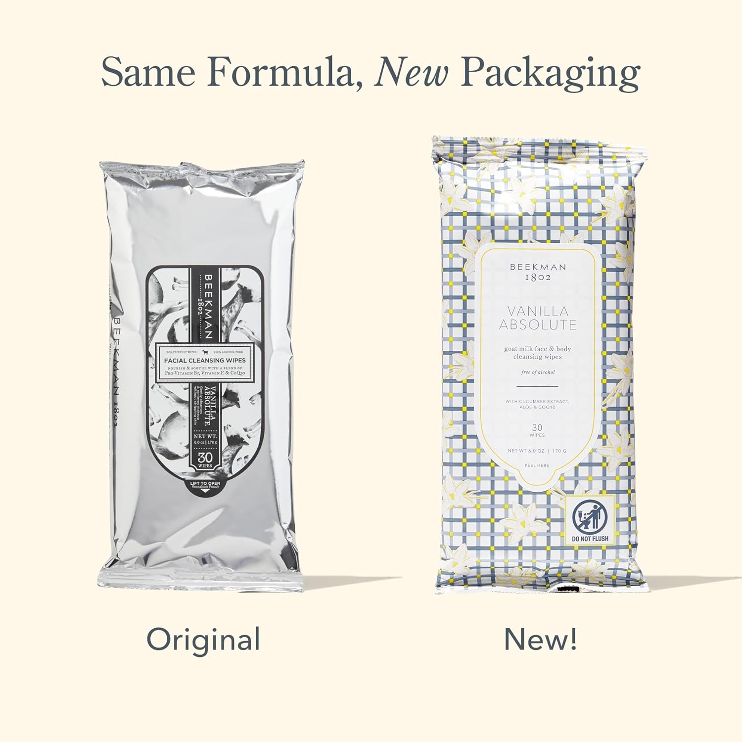 Beekman 1802 Face & Body Wipes, Vanilla Absolute - Scented - 30 Count - Cleanses Dirt & Makeup - With Goat Milk, Aloe & Vitamin E - Alcohol Free, Biodegradable - Good for Sensitive Skin - Cruelty Free