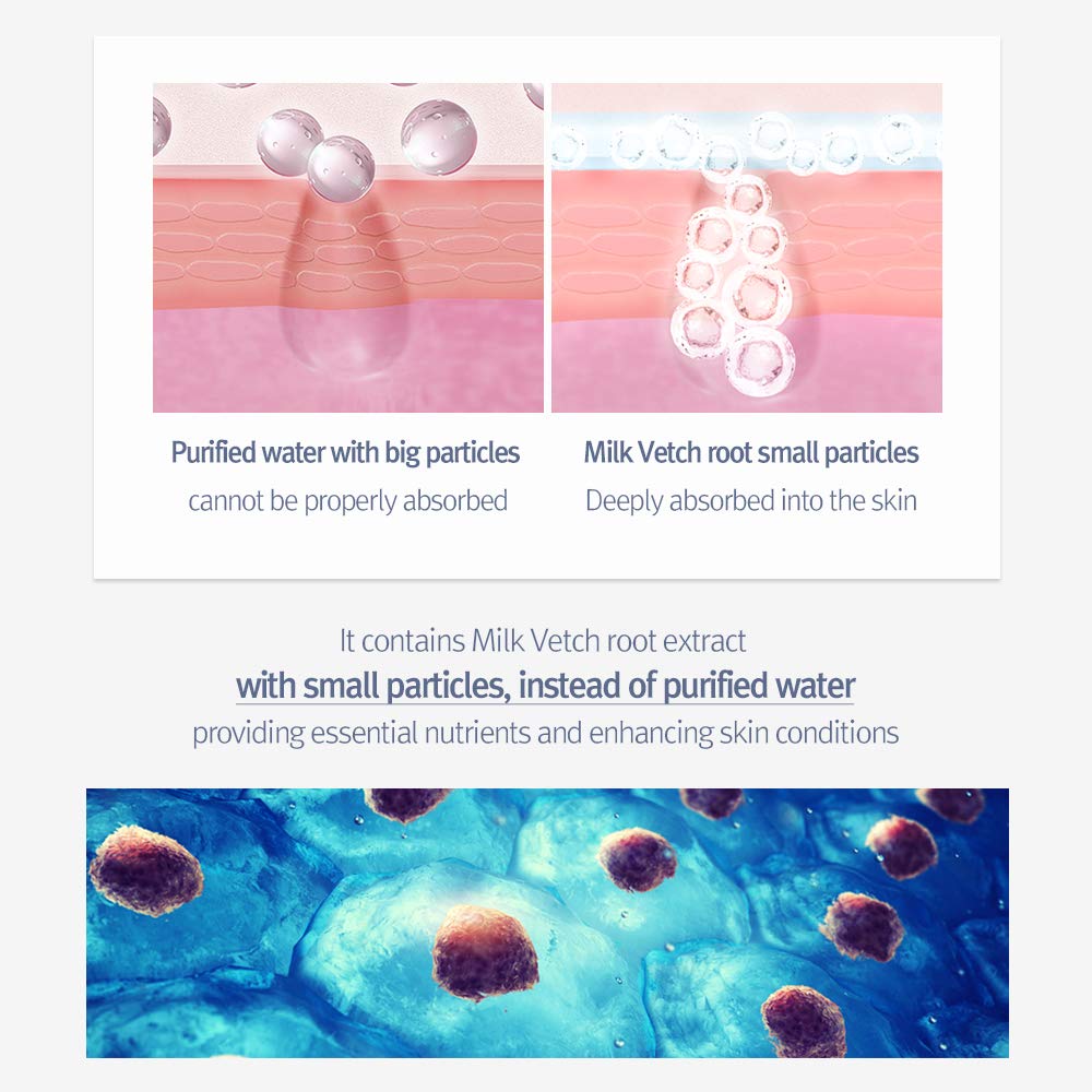 • DEEP ABSORBING: Instead of purified water, Milk Vetch Root's fine particles deeply penetrate deep into the dermal layer, providing essential nutrients and enhancing skin conditions.