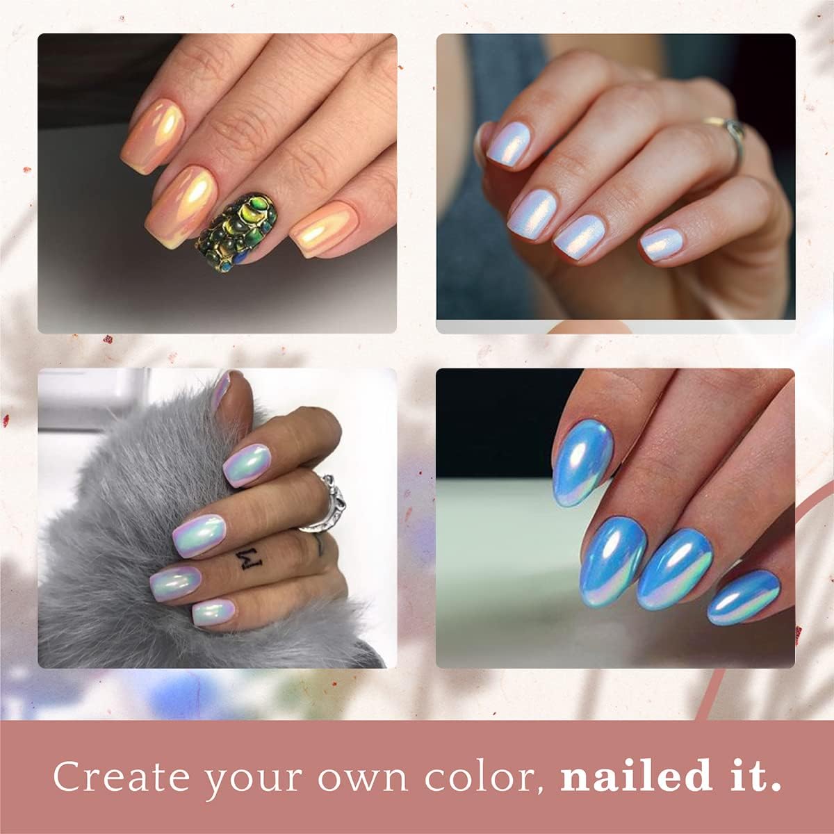 • 【Multi-chrome Effect】: Enjoy a green/sunset chameleon effect when applied over dark base gels, or a white iridescent mermaid effect when applied over light base gels, If you’re looking to match our images, you must apply 2 layers of powder over a white gel base for desired coverage