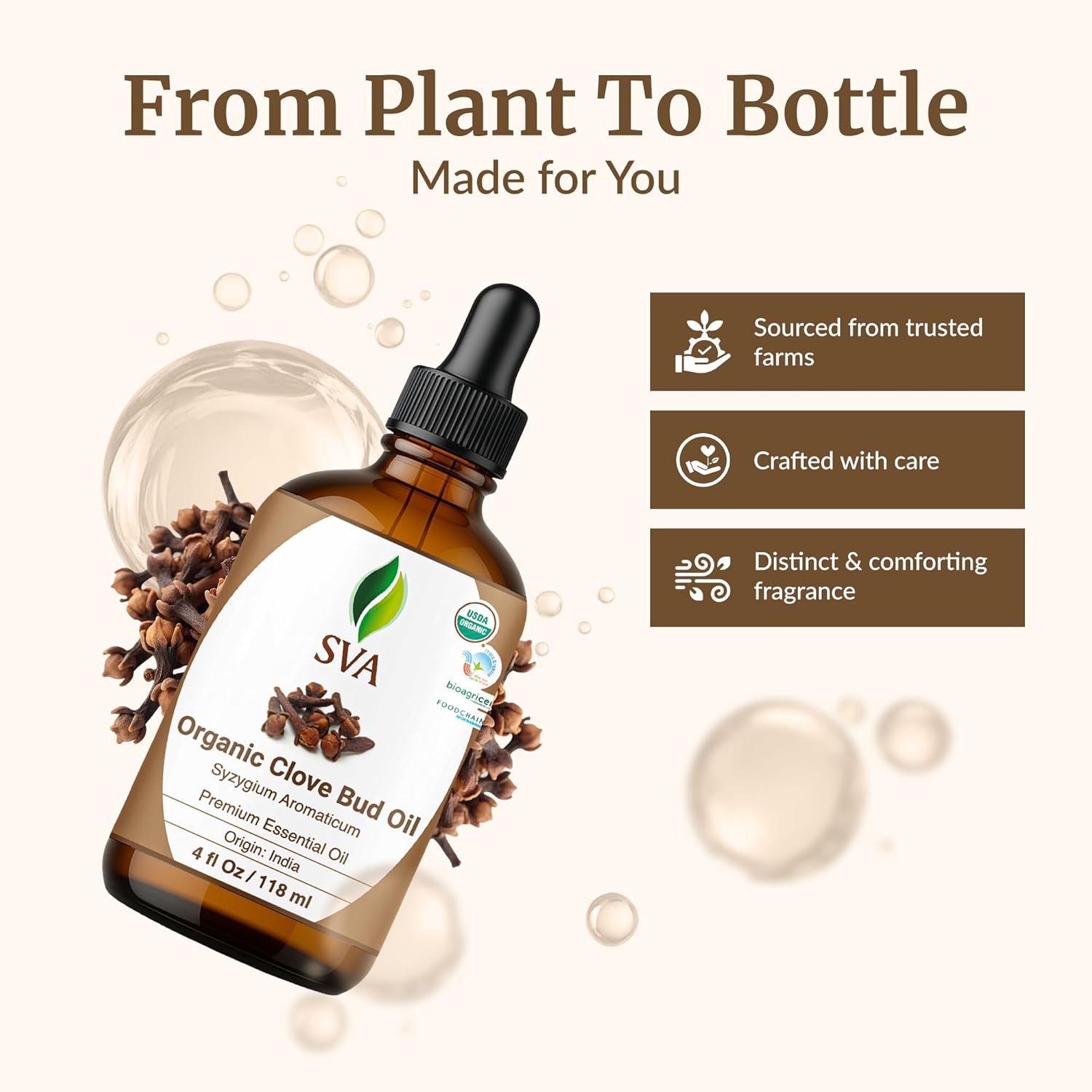 • Premium Quality Organic Clove Bud Essential Oil: SVA Organic Clove Bud Oil essential oil 4oz is obtained by steam distillation of Syzygium aromaticum L. bud. Our Clove Bud oil is free of preservatives and comes with a dropper for easy application. It is not tested on Animals. We care for you!