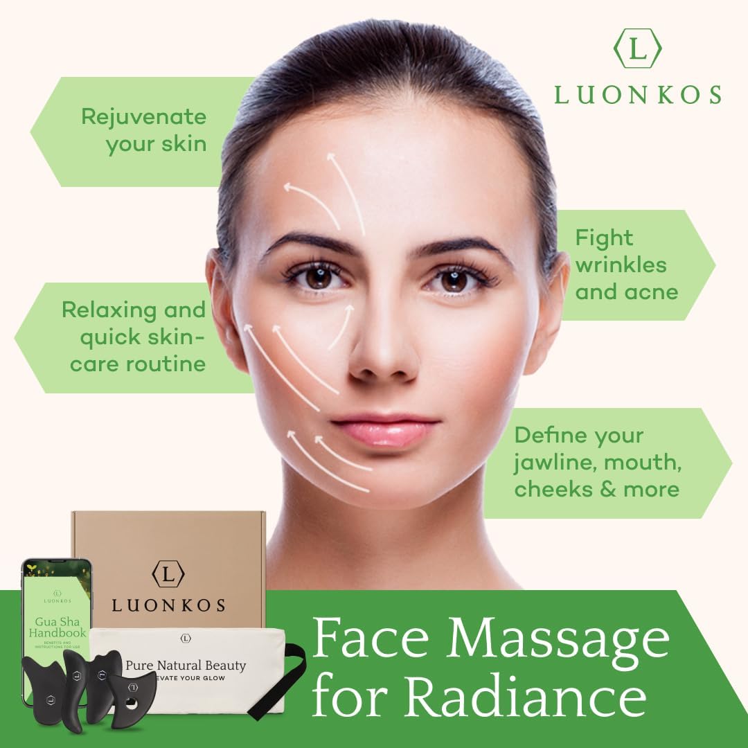 LUONKOS Gua Sha Tools Set - Large Black Bian Stone, 4-Pc - Face & Lymphatic Drainage Massager - Skin Care & Face Sculpting Tool