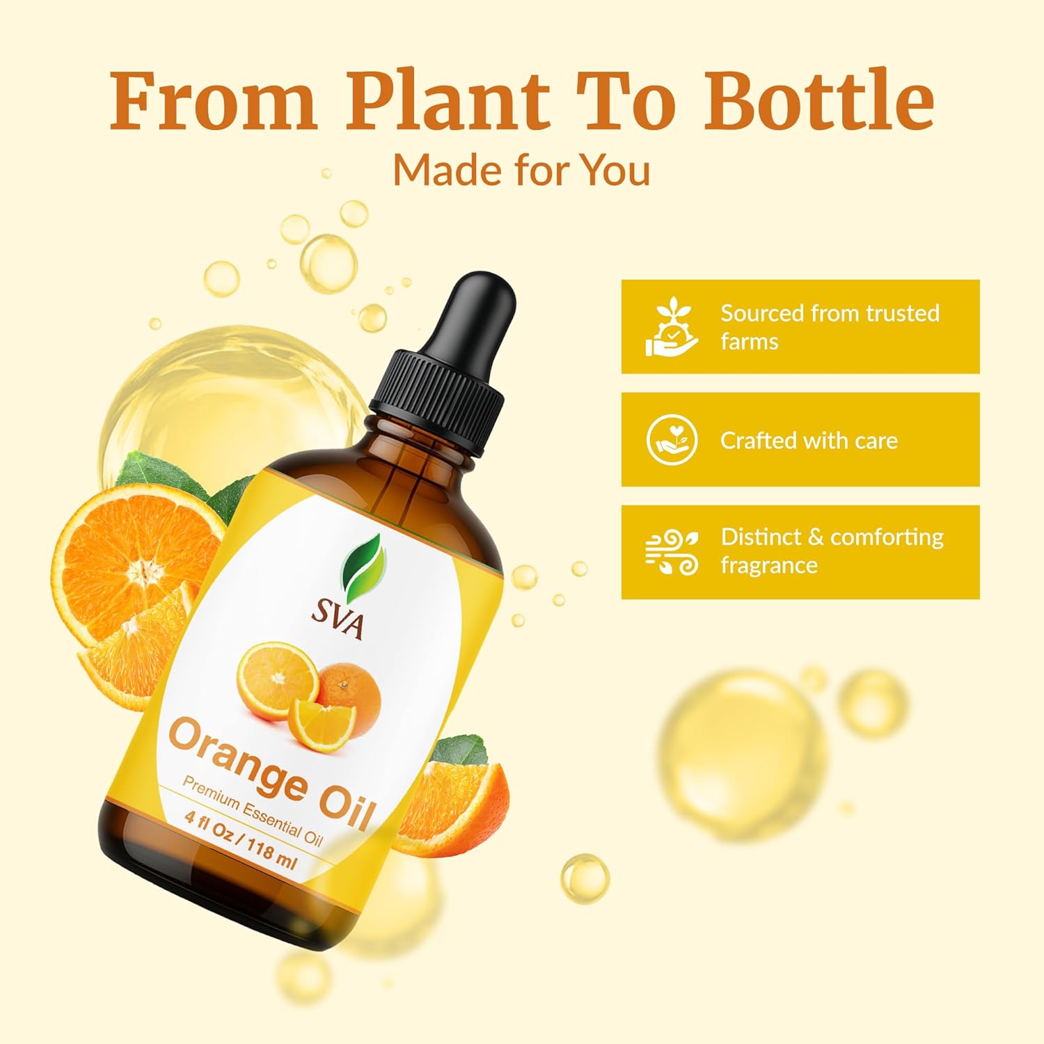 • Premium Quality Orange Essential Oil: SVA Orange Essential Oil 4oz is an essential oil and is obtained by cold-pressed extraction of Citrus Sinensis rind. Our Orange essential oil is free of preservatives and comes with a dropper for easy application. It is not tested on Animals. We care for you
