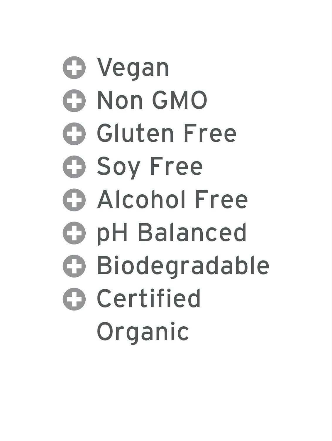 • Alcohol Free, Biodegradable, Certified Organic, Gluten Free, Paraben Free, Non GMO, pH Balanced, Soy Free, Vegan