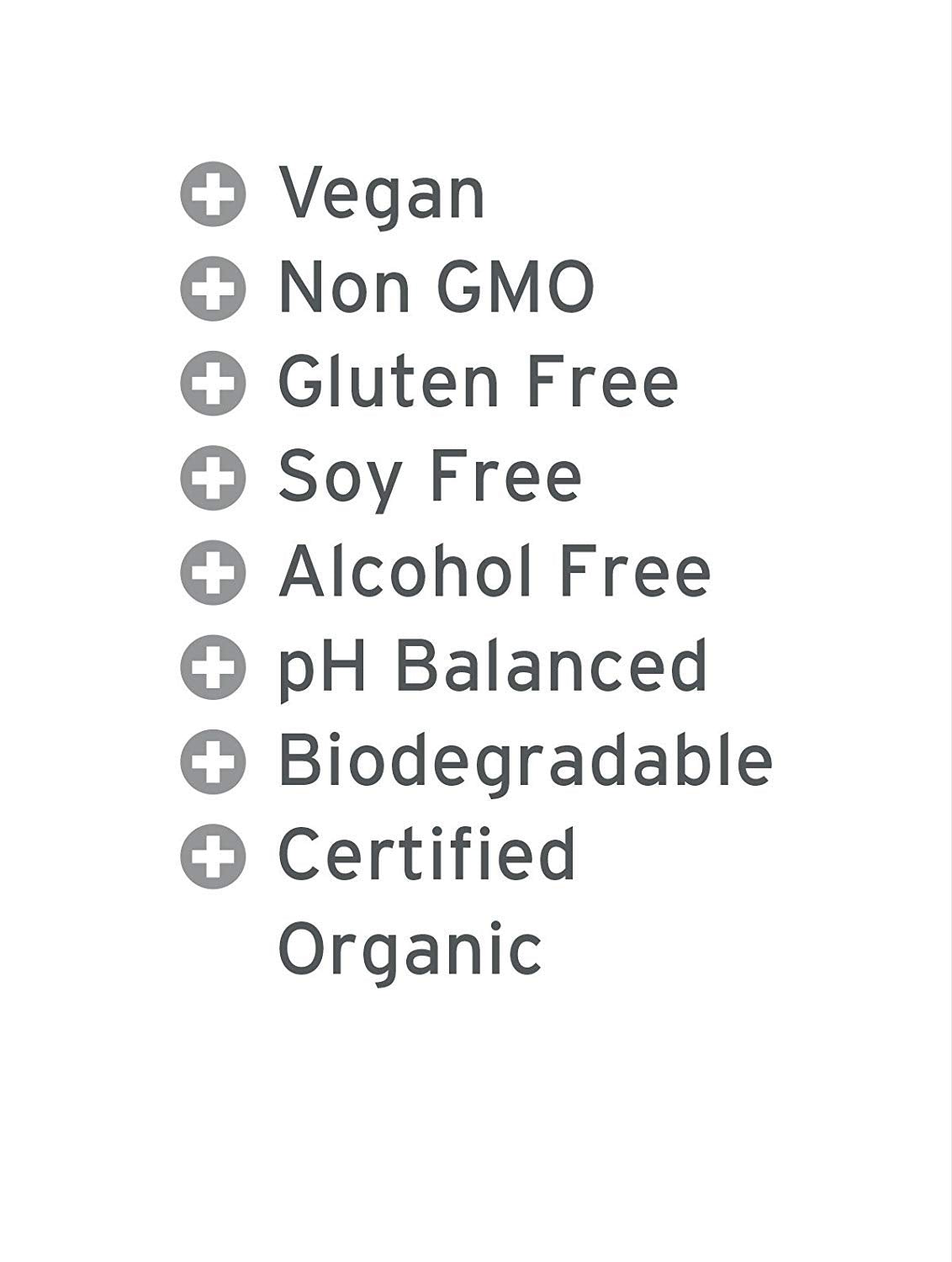 • Alcohol Free, Biodegradable, Certified Organic, Gluten Free, Non GMO, pH Balanced, Soy Free, Vegan