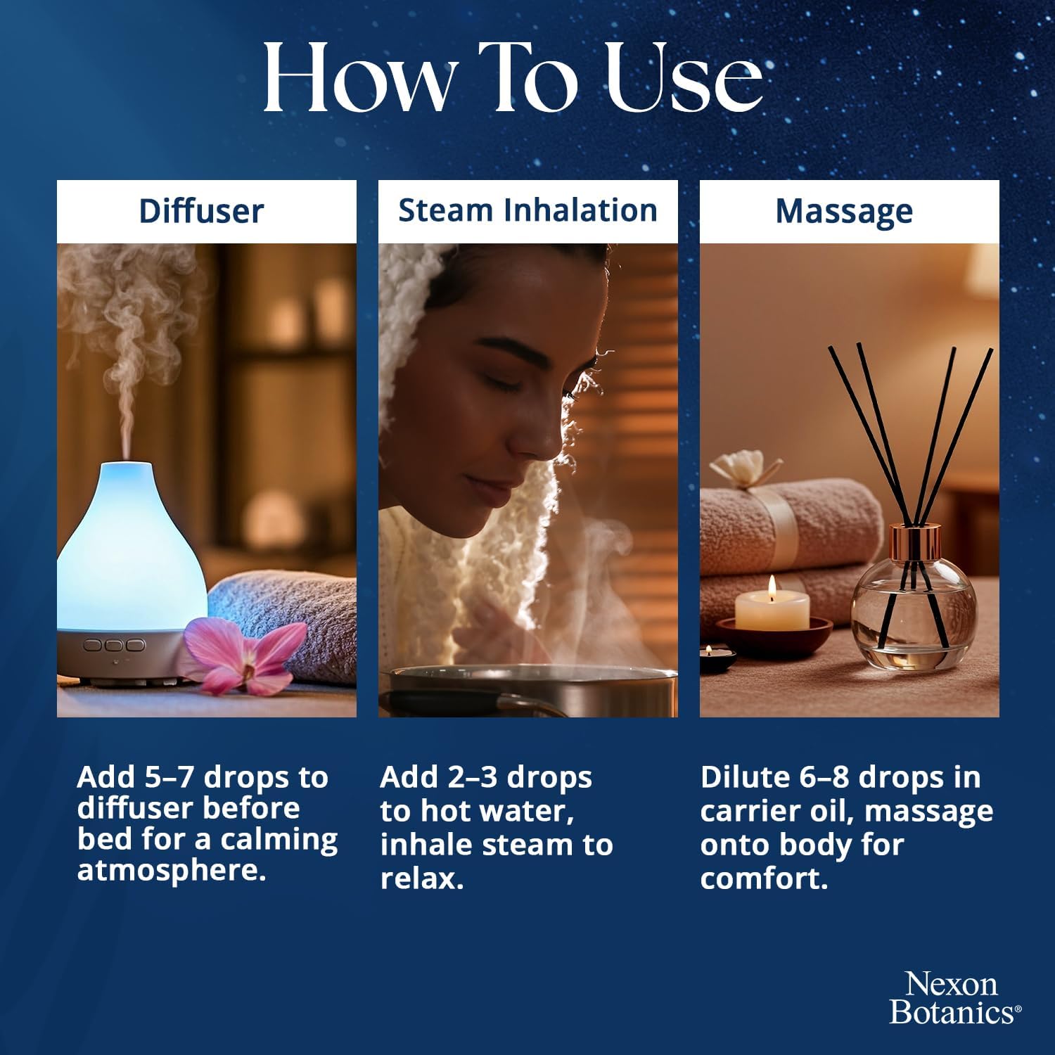 • Aromatherapy: This sleep essential oil can be used for aromatherapy and relaxation; Use in a diffuser or humidifier to help encourage a calm environment; Adding essential oil for sleep to the bath is a great way to unwind before bed.