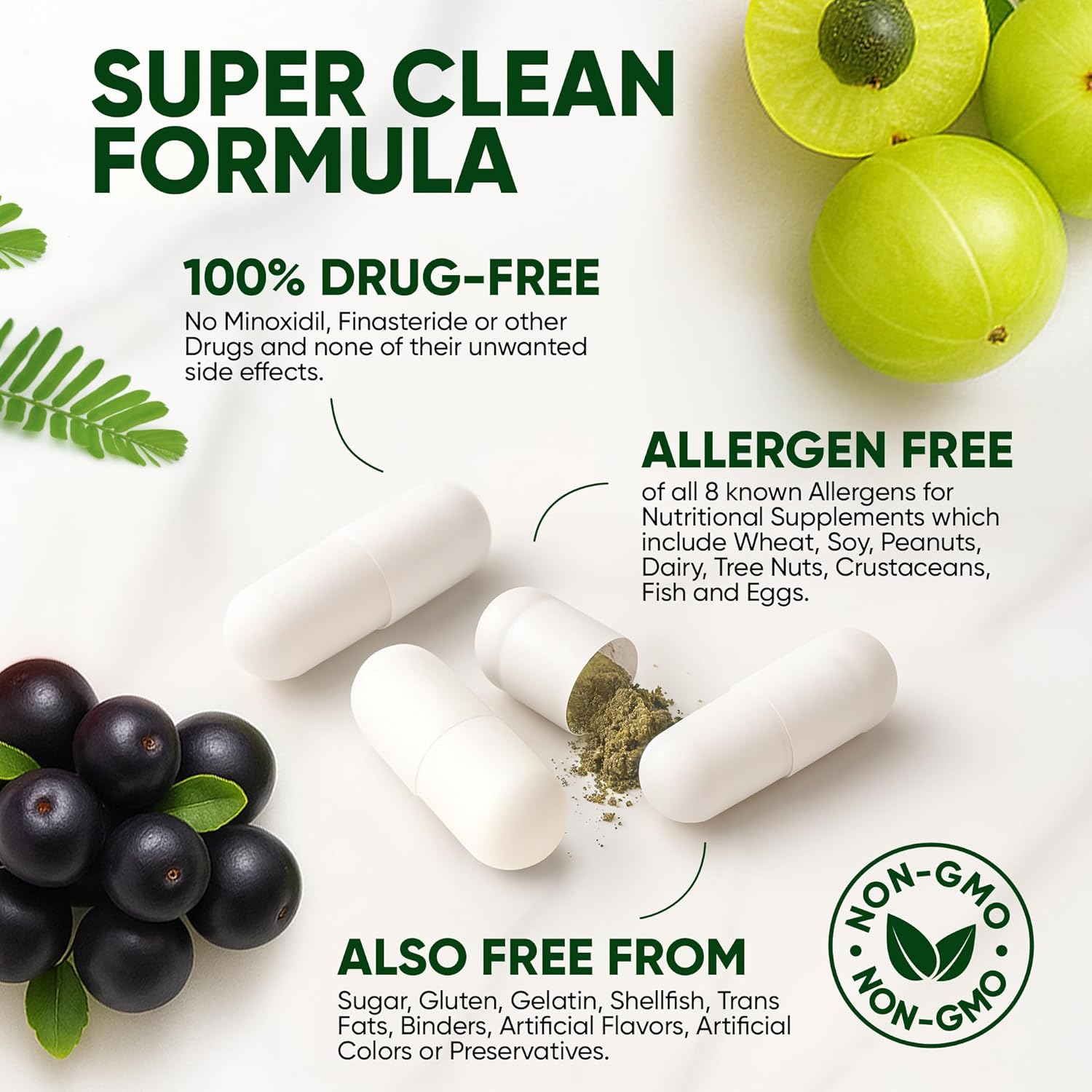 • Natural and 100% Drug Free: A Clean Formula Hair Growth Supplement For Hair Thinning and Hair Loss; With No Minoxidil, No Finasteride, And No Side Effects