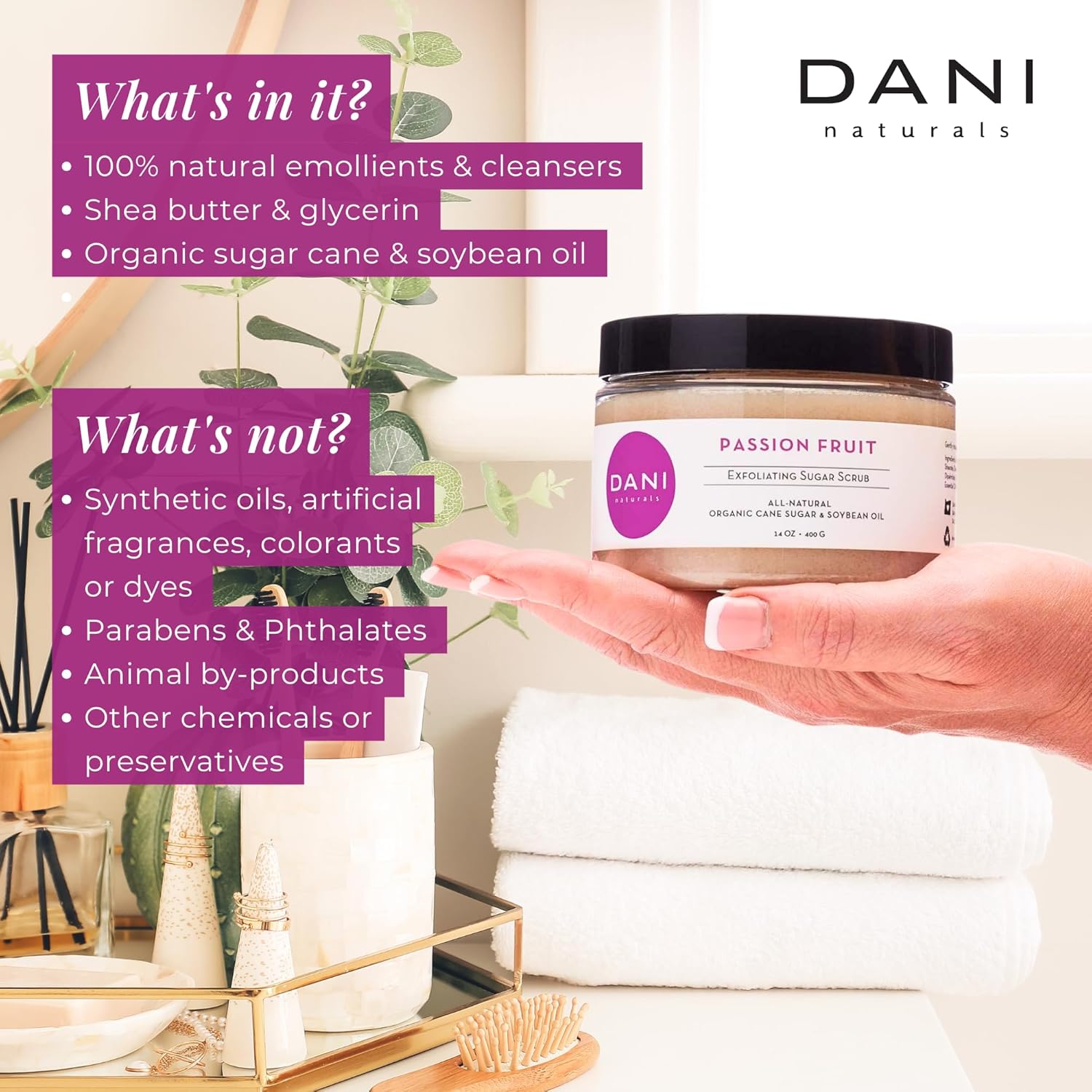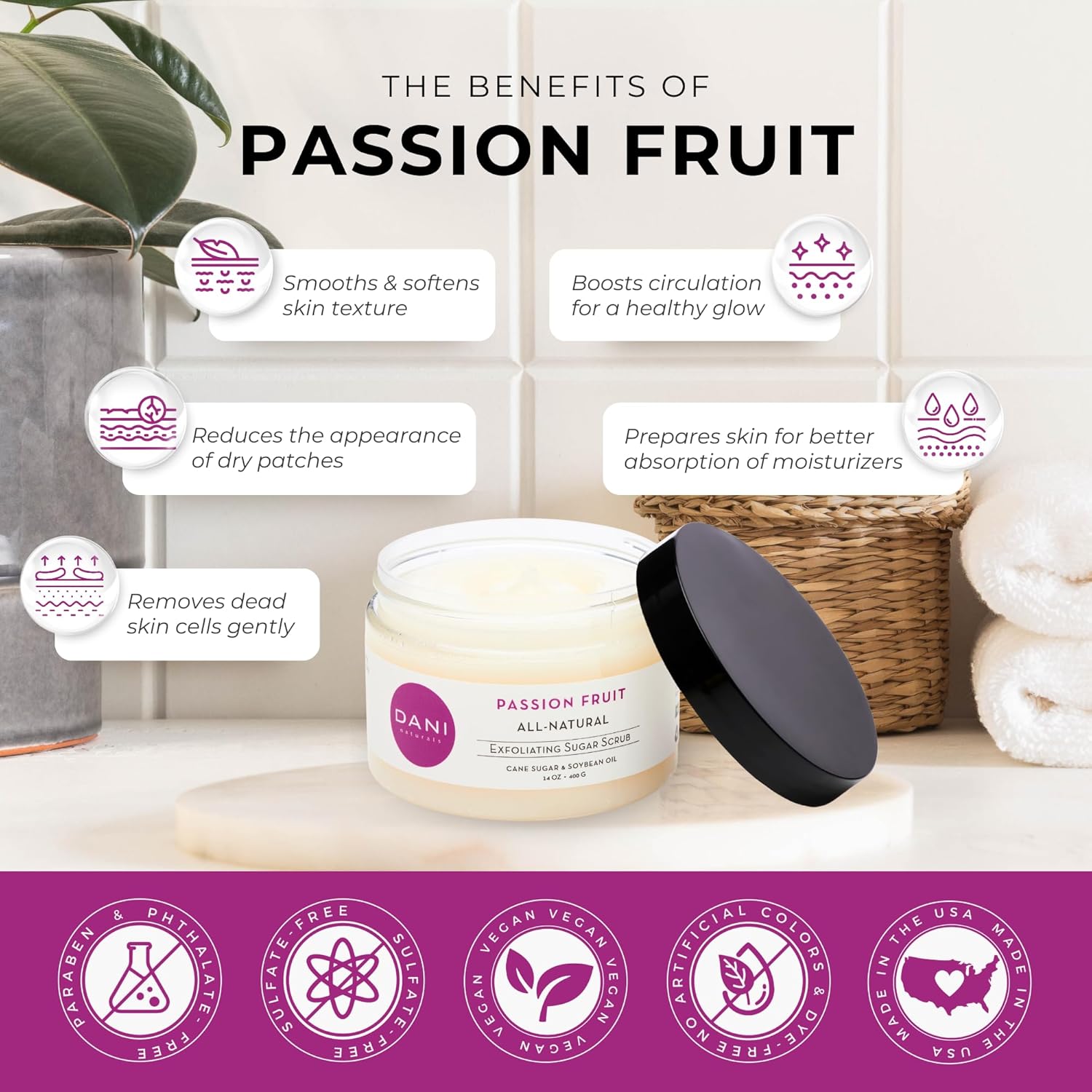 • ● Radiant Skin & Gentle Exfoliation – Organic cane sugar exfoliates to reveal smoother, softer skin. Perfect for face & body, leaving skin refreshed with Passion Fruit