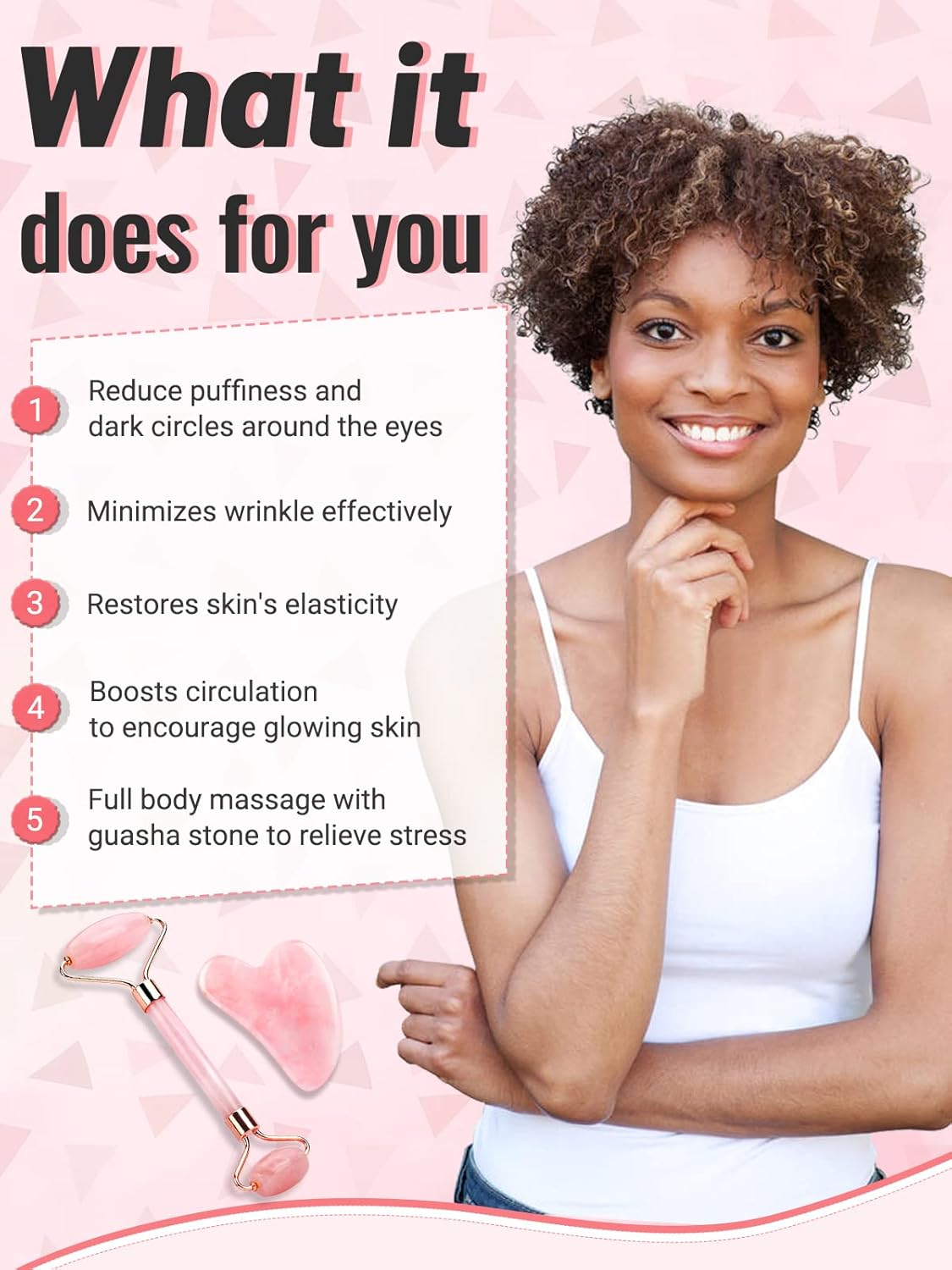 • √ Beauty Skin Care Tools Set - Jade facial roller and Rose quartz Gua Sha stone in the gift box. Roller is ideal for the neck, chin, cheeks, forehead, eyes, nose.You can keep the facial jade roller and Guasha in the fridge.Ice rollers help reduce morning swelling on the skin.