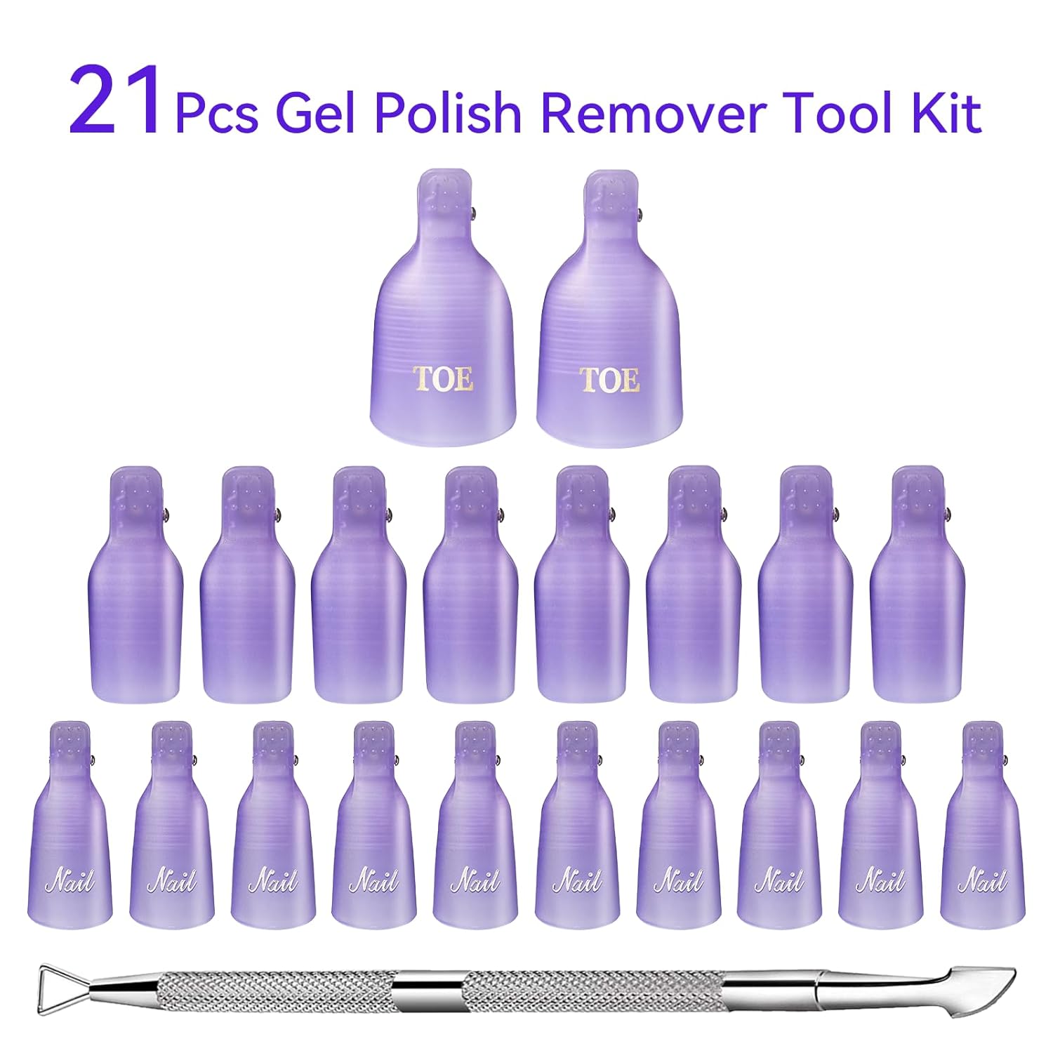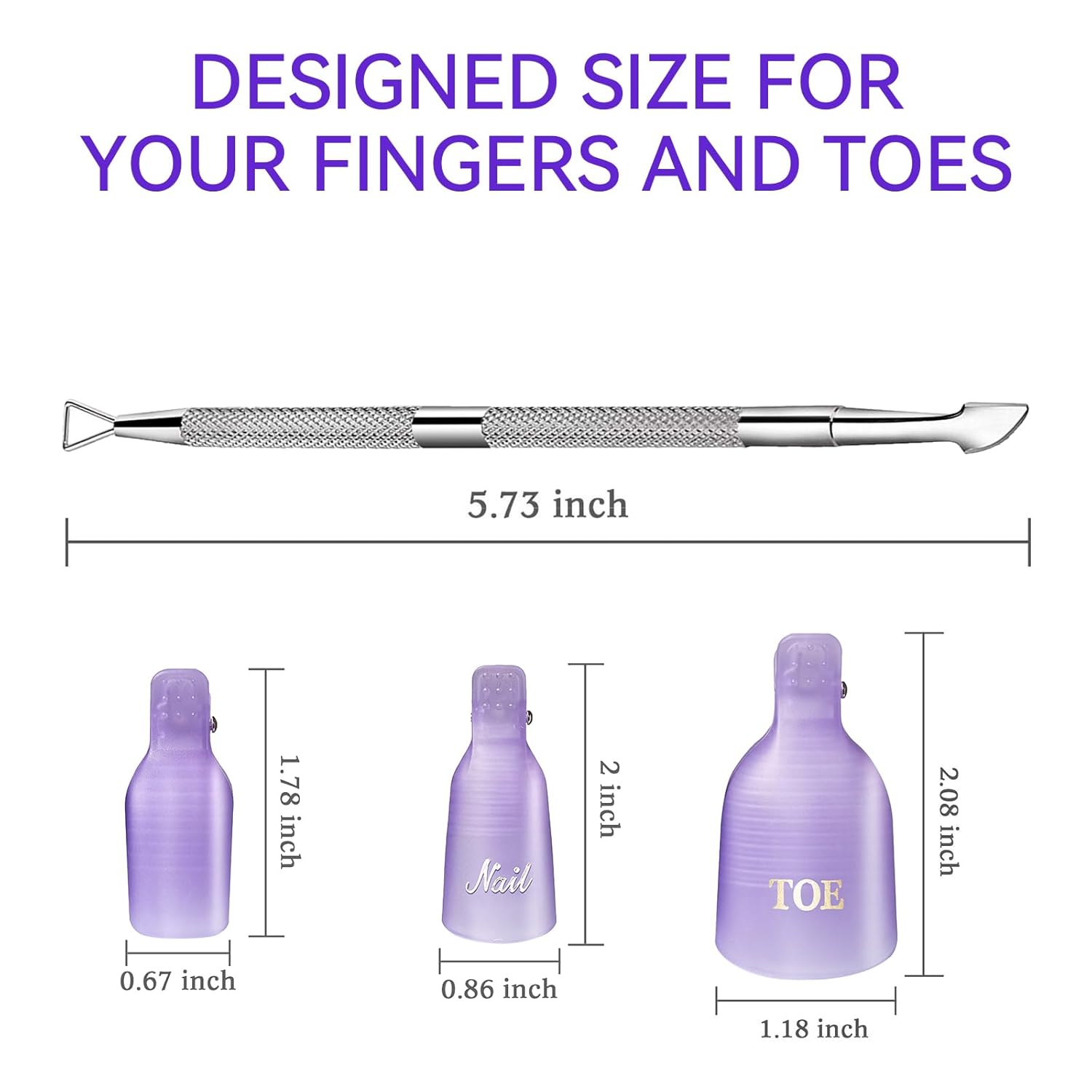 • 【All-in-One Nail Gel Remover Kit】This complete kit includes 10 soak-off clips for fingers, 10 for toes, and 1 double-ended nail pusher—everything you need for quick and efficient gel polish removal at home or in professional salons.