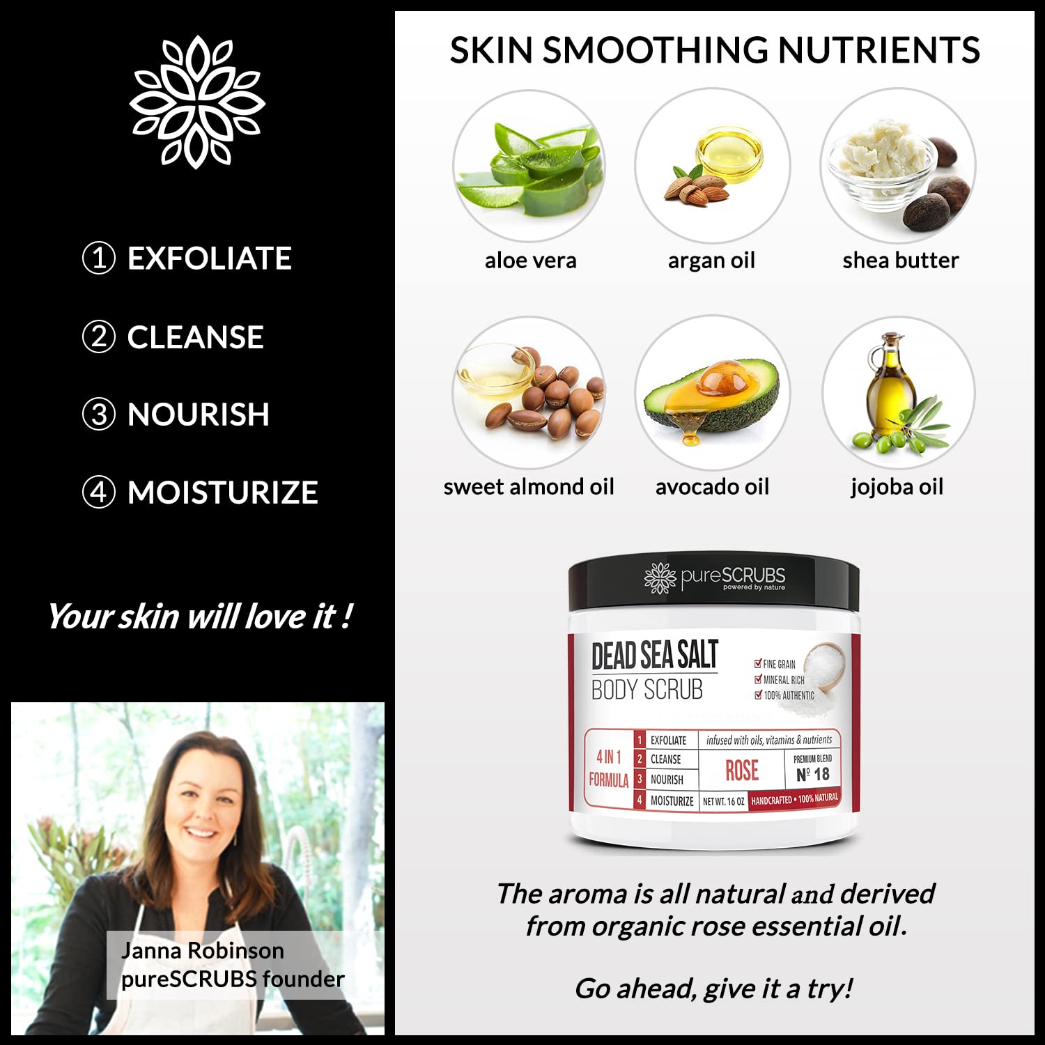 • GET ULTRA SMOOTH SKIN FAST - THIS WORKS! Our unique “4 in 1 Formula” does everything a body scrub should do and more - EXFOLIATE, CLEANSE, NOURISH & MOISTURIZE. Fine grain dead sea salt infused with essential oils, nutrients and skin softeners helps to smooth away rough, bumpy, and uneven textures to instantly reveal your true soft, healthy and radiant skin. You'll love the aroma of fresh roses!