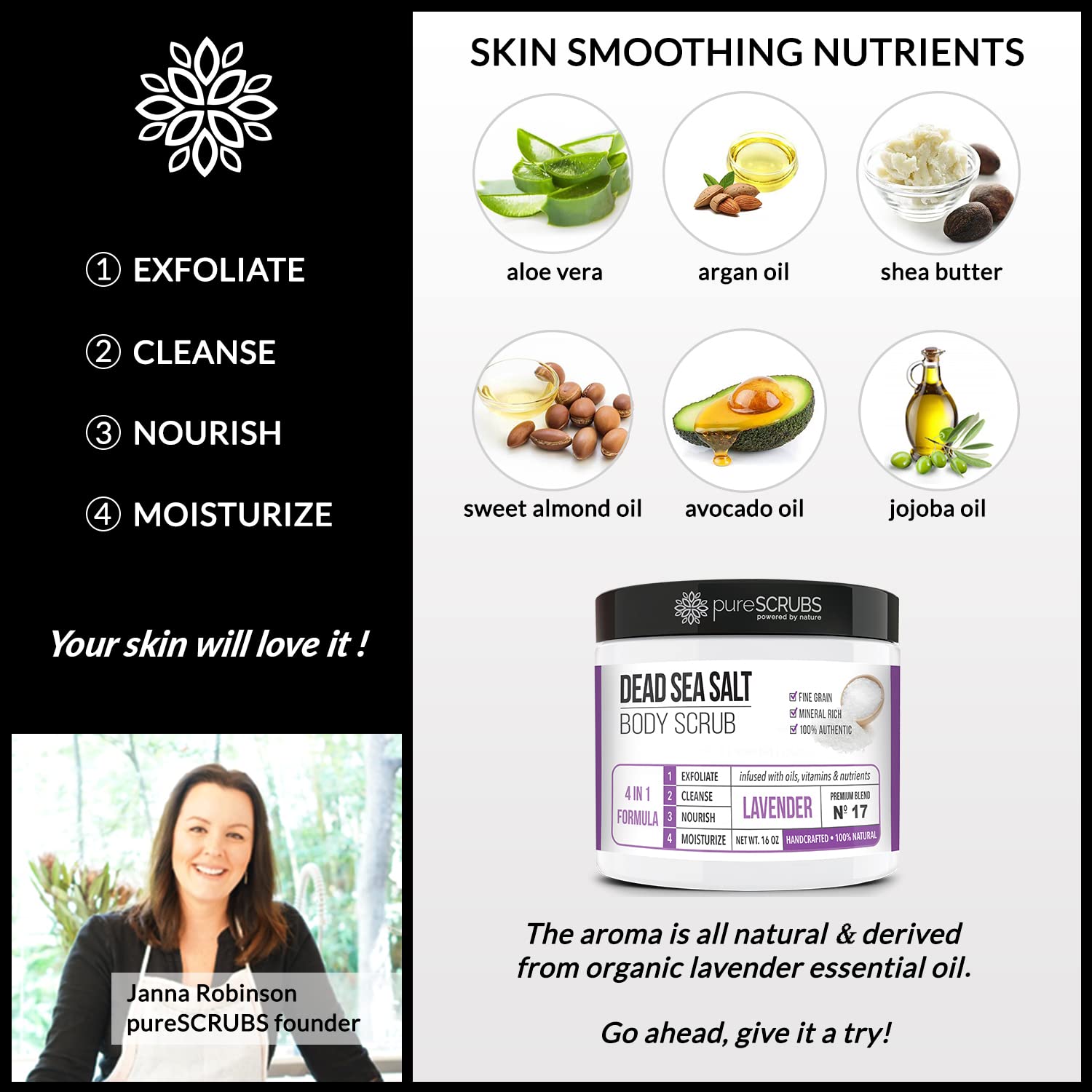 • GET ULTRA SMOOTH SKIN FAST - THIS WORKS! Our unique “4 in 1 Formula” does everything a body scrub should do and more - EXFOLIATE, CLEANSE, NOURISH & MOISTURIZE. Fine grain dead sea salt infused with essential oils, nutrients and skin softeners helps to smooth away rough, bumpy, and uneven textures to instantly reveal your true soft, healthy and radiant skin. You'll love the lavender aroma!