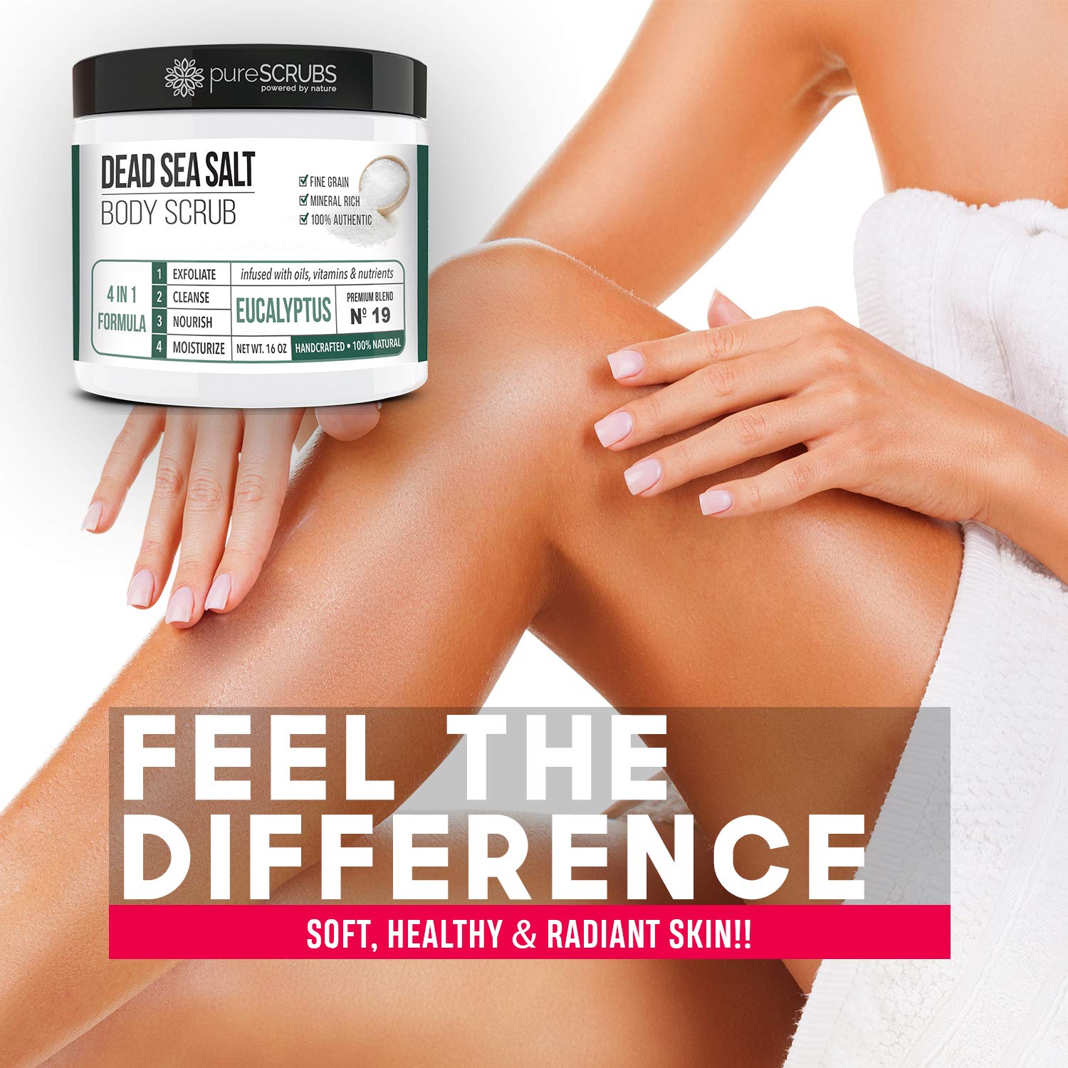 • GET ULTRA SMOOTH SKIN FAST - THIS WORKS! Our unique “4 in 1 Formula” does everything a body scrub should do and more - EXFOLIATE, CLEANSE, NOURISH & MOISTURIZE. Fine grain dead sea salt infused with essential oils, nutrients and skin softeners helps to smooth away rough, bumpy, and uneven textures to instantly reveal your true soft, healthy and radiant skin. You'll love the eucalyptus aroma!