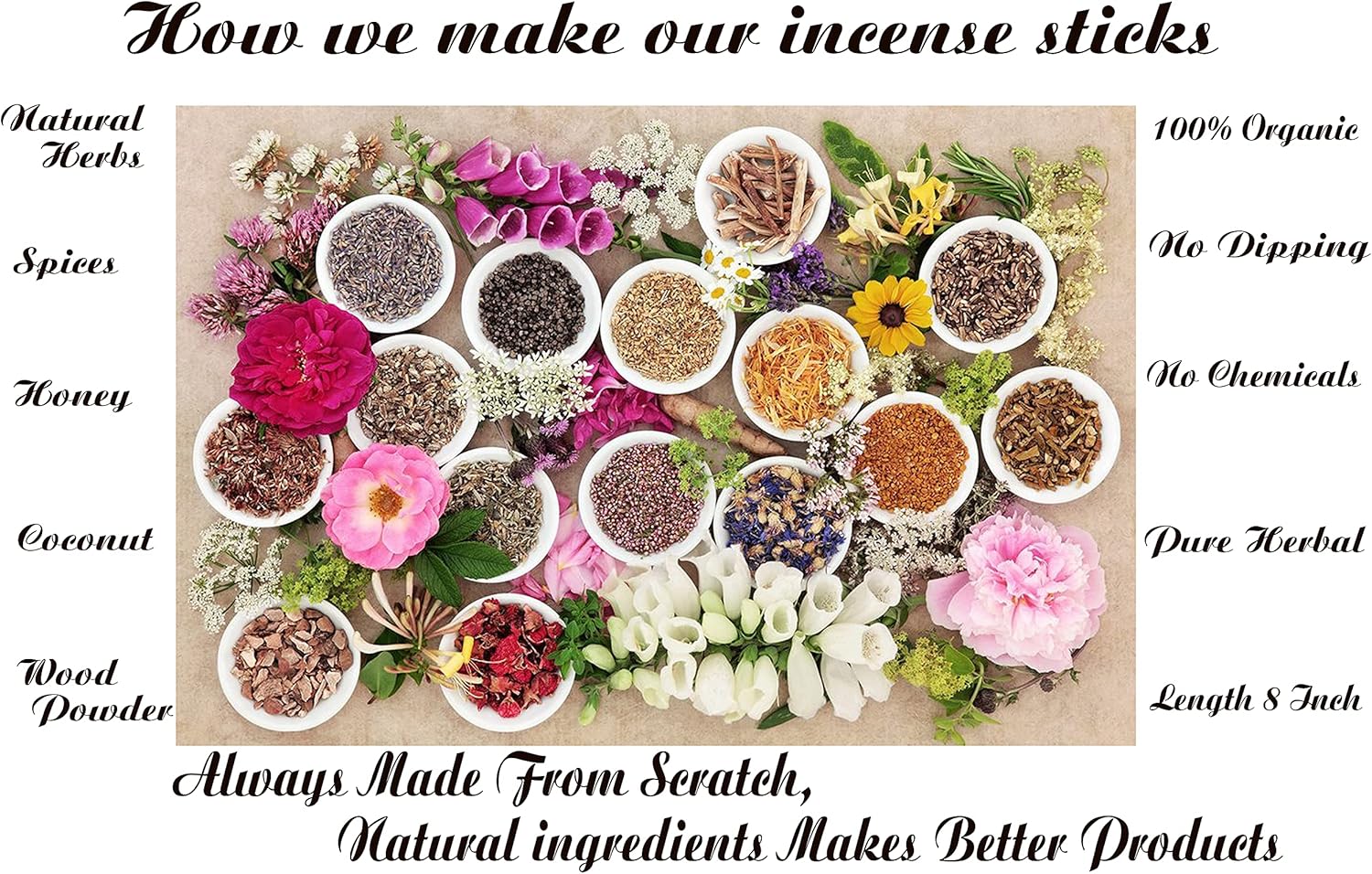 • 100% NATURAL -Lavender Natural incense Sticks completely handmade MADE FROM SCRATCH by blending natural resins, Herbs, Spices with aromatic wood powders, charred coconut powder fragrant oils and honey.No Dipping in Toxic Chemicals.
