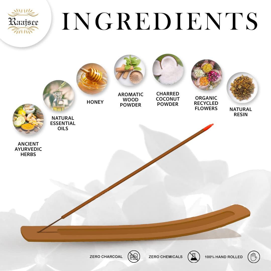 • PRODUCTION METHOD - Hand rolled in India with Indian traditional techniques which lasts longer.Raajsee Incense utilizes fair trade labor and environmentally responsible production methods to give you the best incense around .We lets you be assured that it is free of nasty chemicals like charcoal and other accelerants