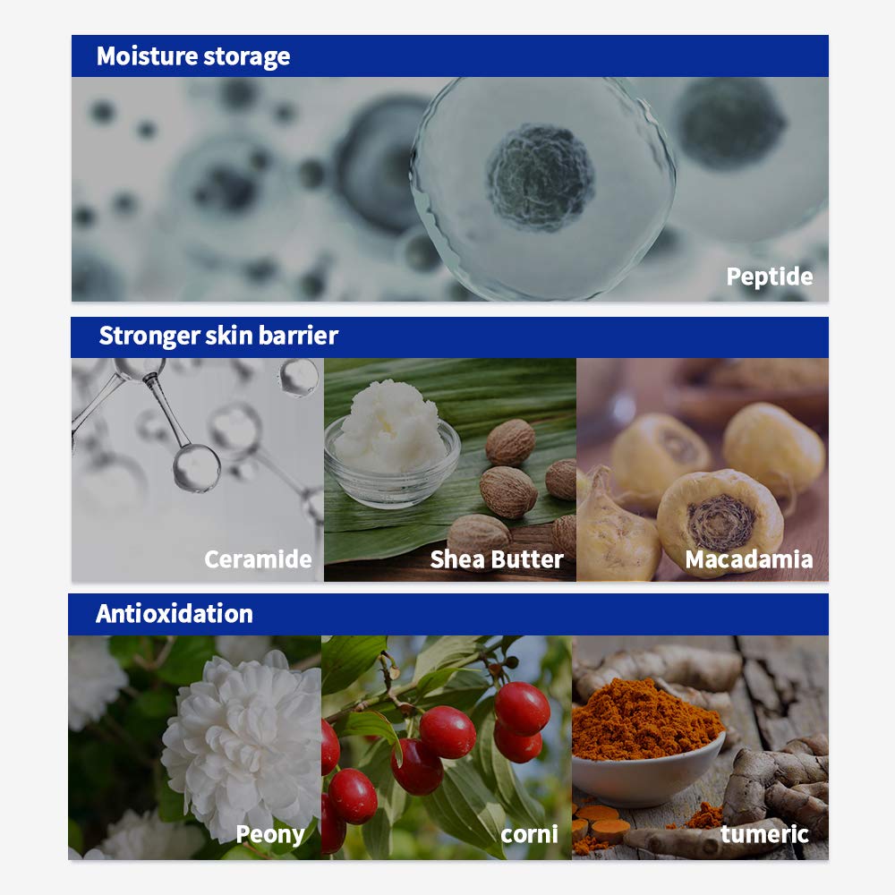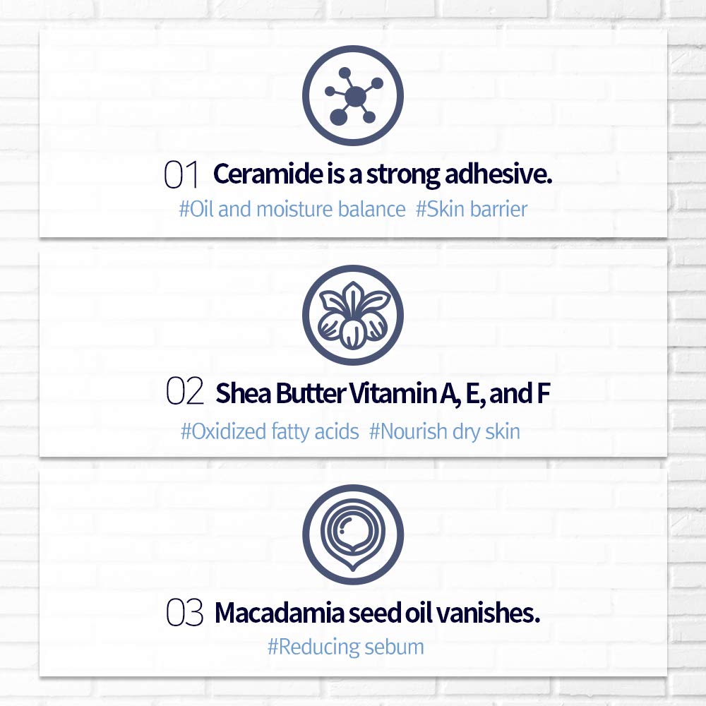 • 3-LAYER SKIN BARRIER - Ceramide in the cream plays the role of mortar which prevents moisture evaporation, adjusting oil and moisture balance properly while reinforcing an imbalanced skin barrier. Moreover, Shea Butter and Macadamia seed oil nurishes dry skin and reduce sebum resulting from aging skin.