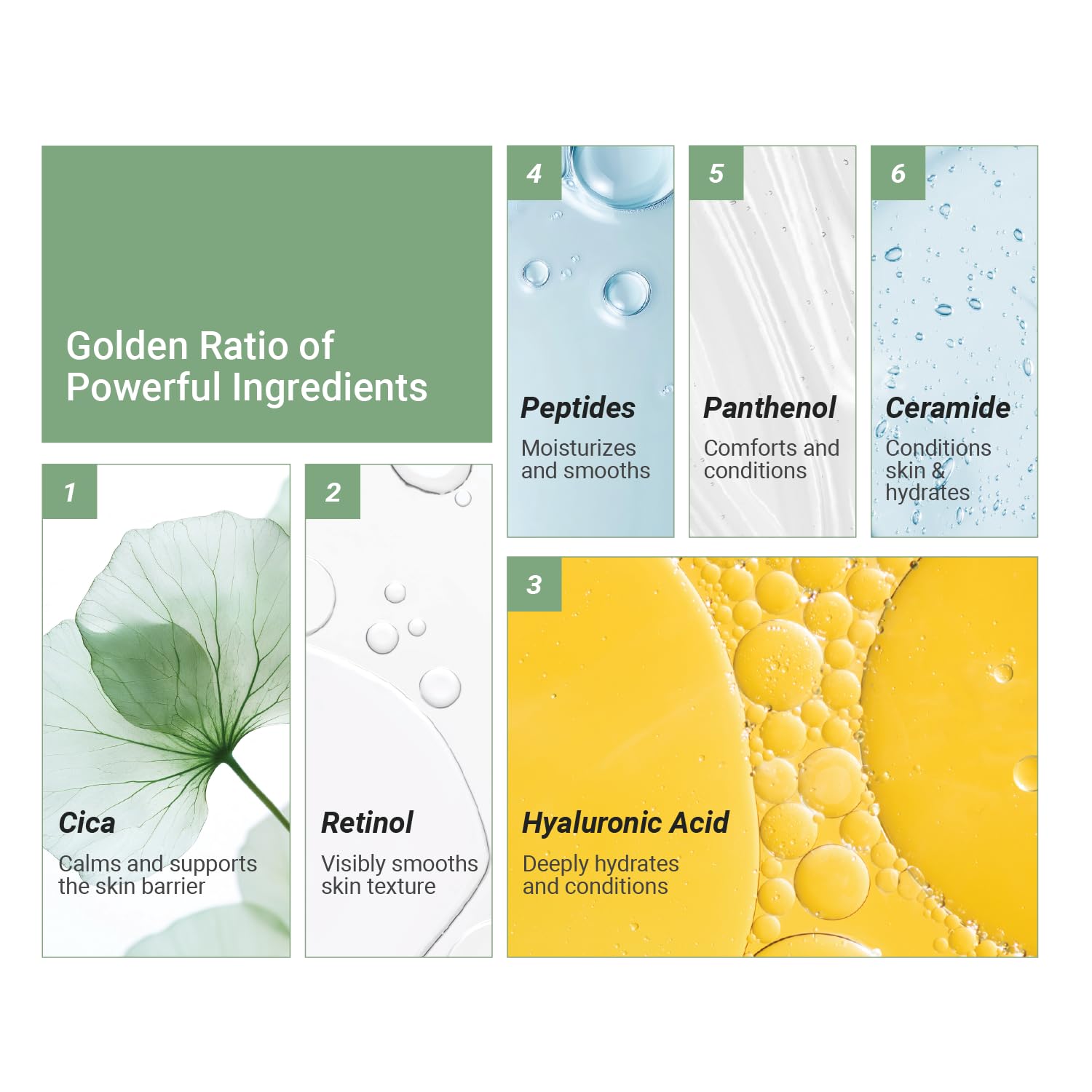 • ALL-IN-ONE SKINCARE: Combines Retinol, Peptides, and Korean Centella Asiatica (Cica) to soothe, protect, and reduce signs of aging while supporting a healthy skin barrier.
