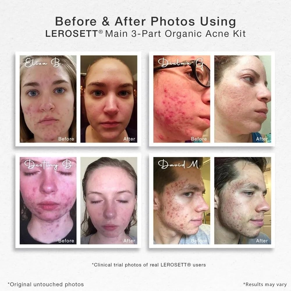 • 🌱 Gentle. Plant-Based Acne Kit: LEROSETT works differently. This 3 part skin care system works to manage acne, breakouts, blemishes, and blackheads. Our chemical-free spot treatment & clay mask helps to quickly clear breakouts; the acne cleanser uses 60% calming aloe vera gel, and the moisturizer matte is lightweight, oil & shine-free. —Vegan. Professional-Grade. Cruelty-Free.