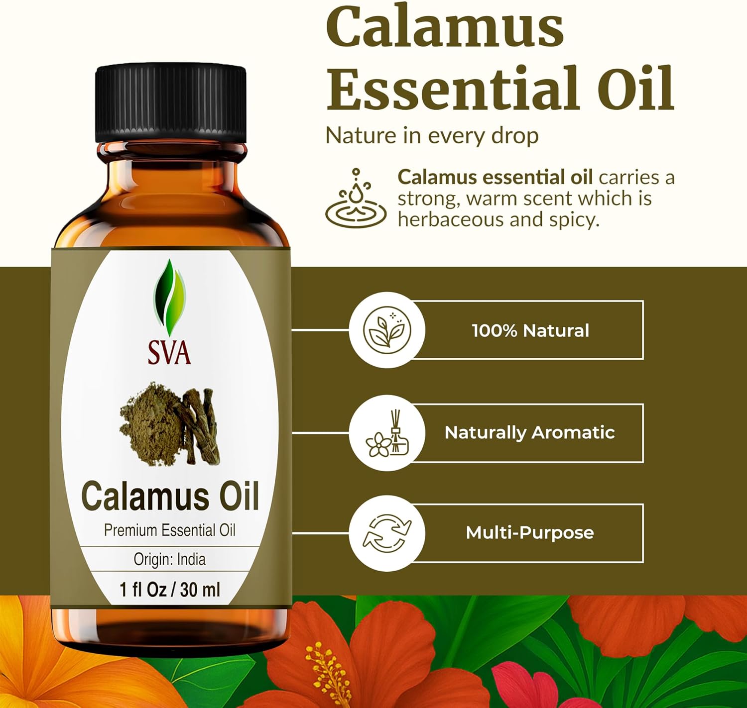 • Premium Quality Calamus Essential Oil: SVA Calamus essential oil 1 Fl Oz is obtained by steam distillation of Calamus plant stems. Our Calamus essential oil is free of preservatives and comes with a dropper for easy application. It is not tested on Animals. We care for you