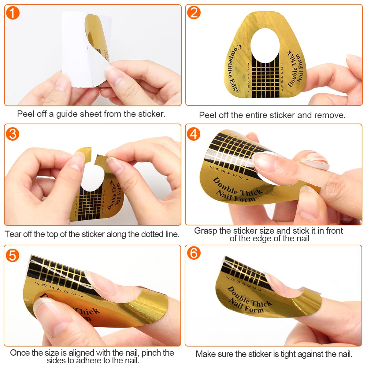 • 【Usage】After you manicure your nails thoroughly, tear off the nail form from a sticker, remove the middle oval-shaped and tear open the ring along the dotted line. hold the scale of the label at the front of the nail edge and keep the extension on the same plane as the nail, then pinch both sides of the forms when the scale fits with the finger, make sure the tips are tight close to your finger, and then apply with poly gel and cure it, final filing the ideal shape and length you want.