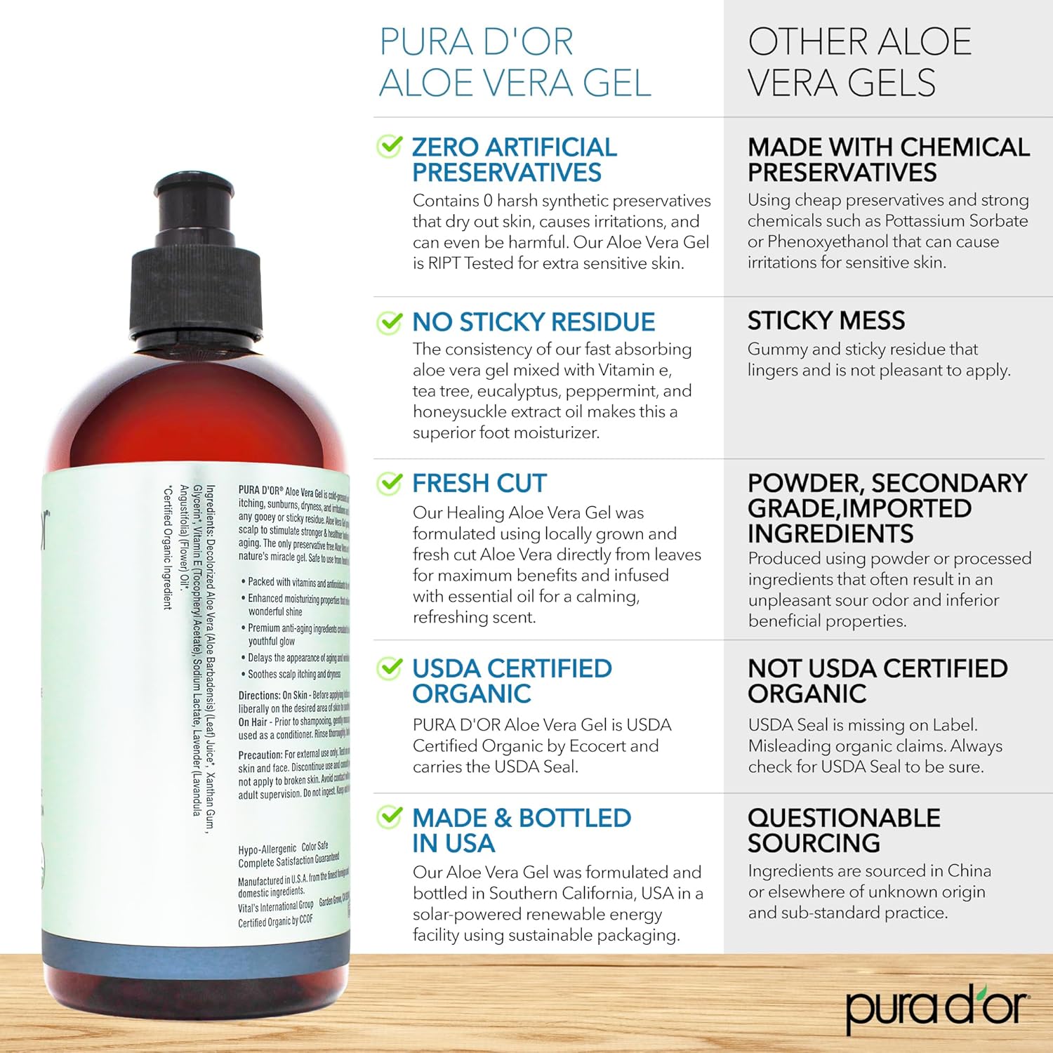 • THE ONLY USDA ORGANIC ALOE VERA GEL ON THE MARKET: PURA D'OR is the Only USDA Certified Organic Aloe Vera Gel on the market currently that has ZERO artificial preservatives and does NOT require refrigeration. Other brands are missing USDA Organic Seal on the Label which means they are not Certified Organic and any Organic claims made elsewhere are misleading and inaccurate. Always check for USDA Seal on Label