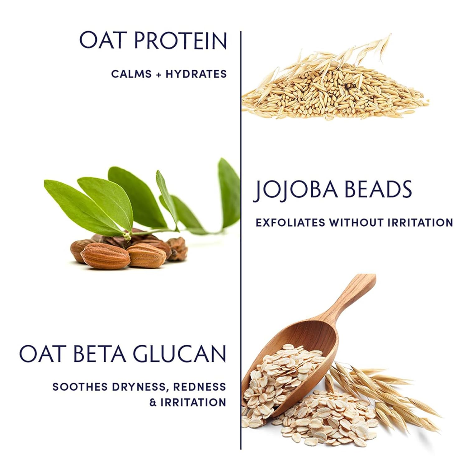 • Exfoliating Face Wash: Jojoba Beads gently exfoliate without damaging the skin barrier, Oat Protein hydrates skin, while Oat beta glucan helps soothe dryness and redness
