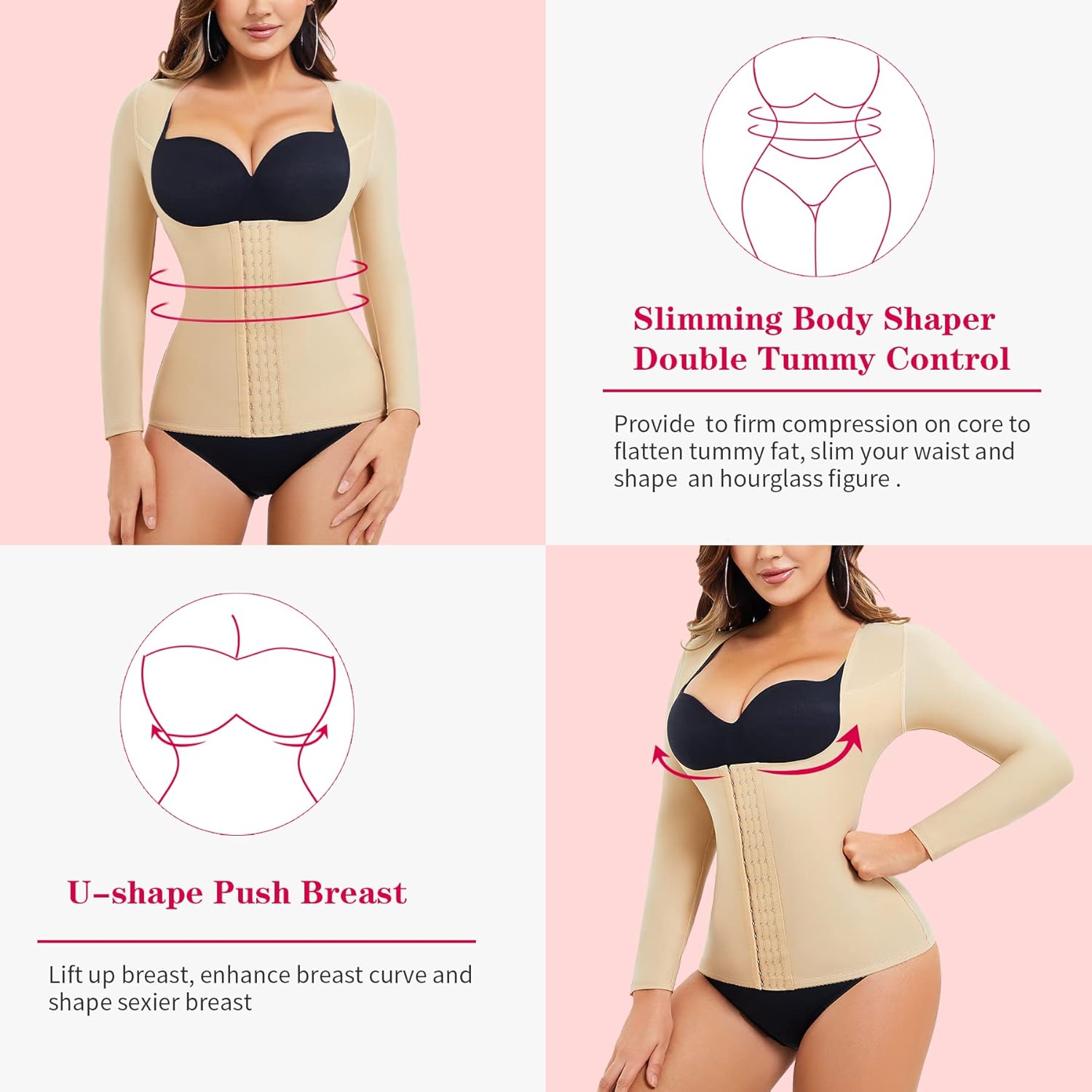 • UPPER ARM SHAPER COMPRESSION : Our waist training corset design with high stretchable long sleeve, best for arm liposuction recovery to tighten loose skin, smooths and tights bumps and bulges, reduce arm and back flab, hide your back rolls, give your a slimmer figure. If you no need too tight,we suggest you to have the bigger size.