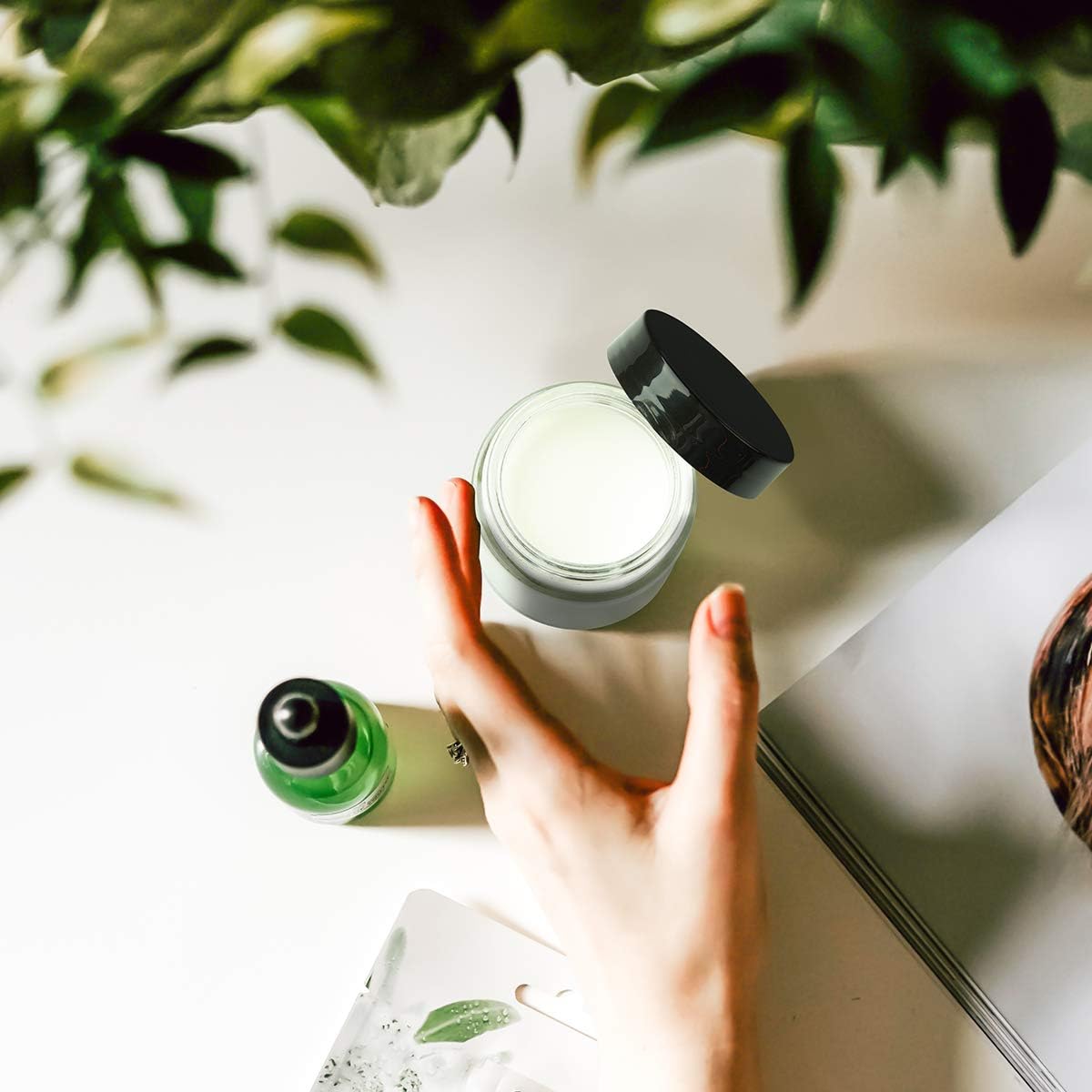 • Great Material: The 2 oz glass jars with lids made of great material clear glass, is no bad smell, does not influence your skincare products, stable, high temperature resistance, a black plastic cover with lid, no BPA, sealed storage, and does not leak