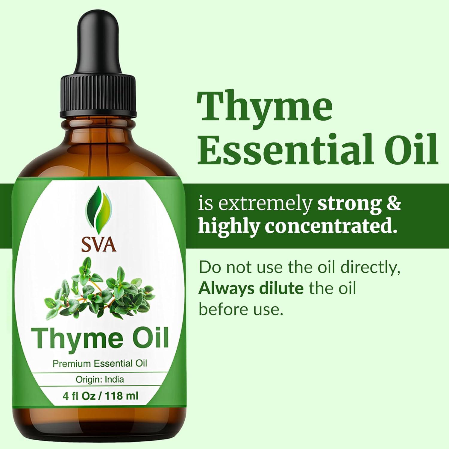 • Premium Quality Thyme Essential Oil: SVA Thyme Essential Oil 4oz is an essential oil and is obtained by steam distillation of Thymus vulgaris. Our Thyme oil is free of preservatives and comes with a dropper for easy application. It is not tested on Animals. We care for you!