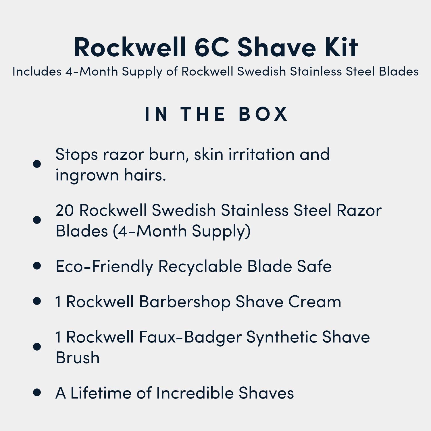 • KIT INCLUDES: 6C White Chrome Rockwell Razor, Barbershop Shave Cream, Faux-Badger Shave Brush and 5 Pure Swedish Stainless Steel Blades