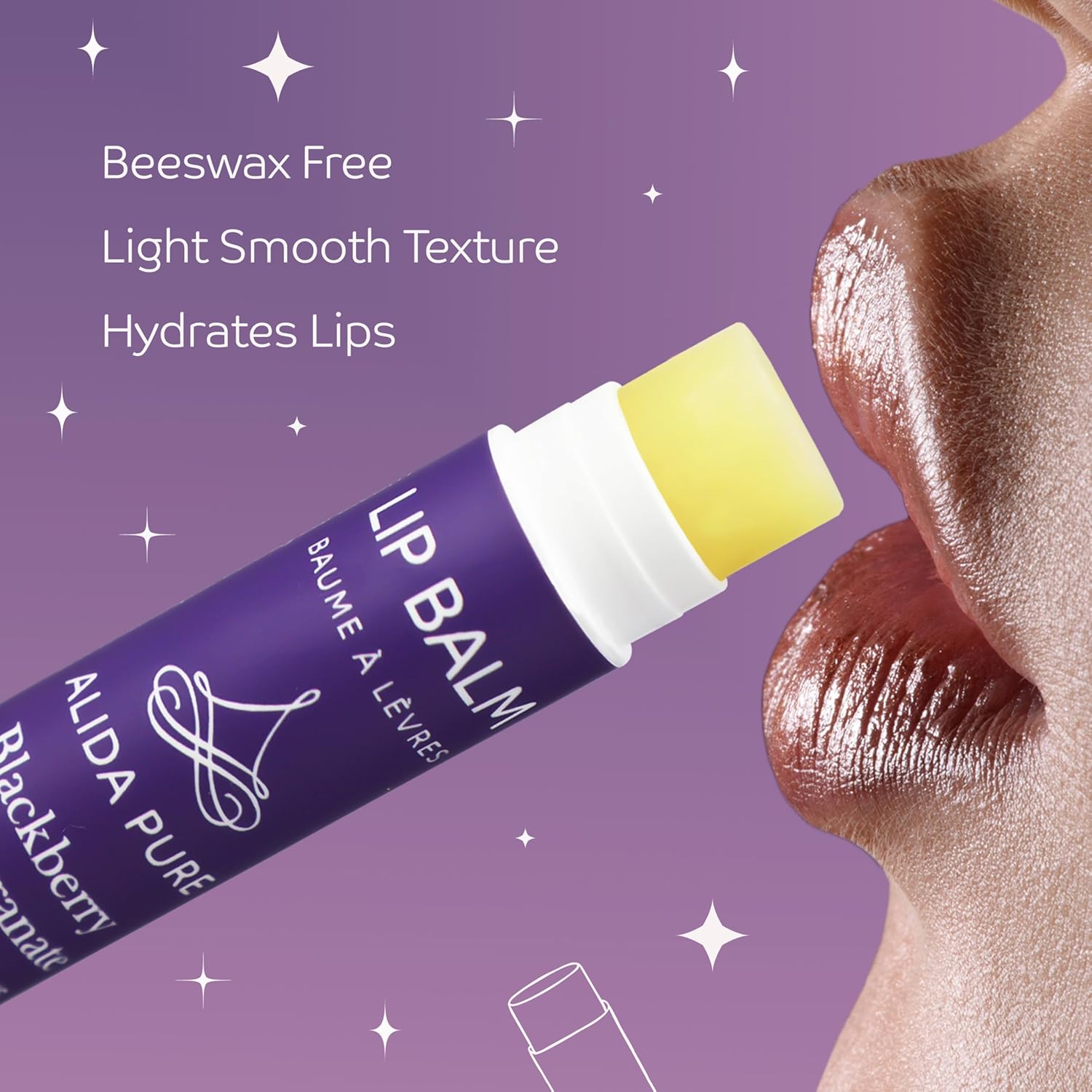 • ALIDA PURE Blackberry Pomegranate Lip Balm Collection, uses avocado oil, and candelilla wax, to protect and nourish. Organic jojoba oil is rich in nutrients, and aids in healing dry chapped skin. Organic castor oil deeply moisturizes the skin and revitalizes skin cells. With delicious, warm blackberry pomegranate flavor and nutrient packed blackberry seed oil.