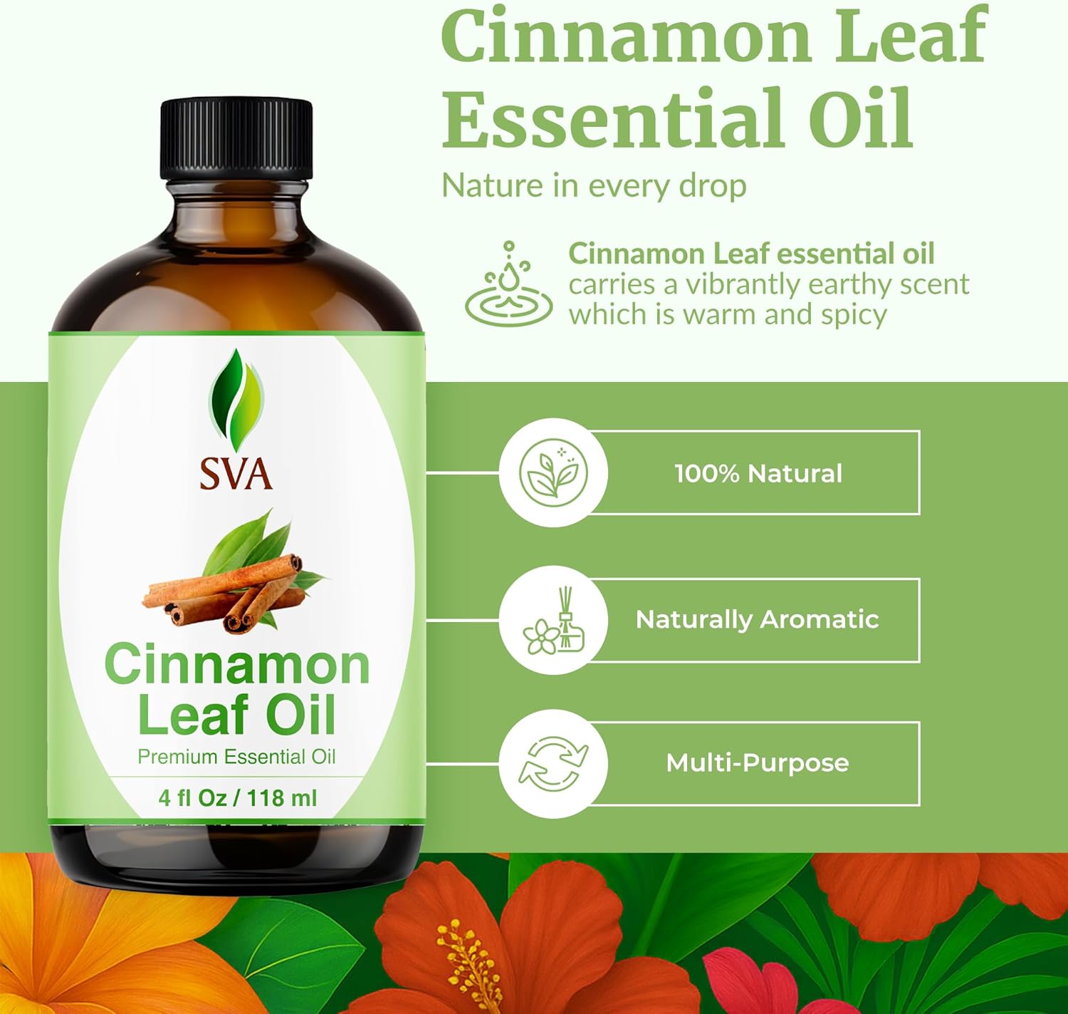 • PREMIUM QUALITY CINNAMON LEAF ESSENTIAL OIL: SVA Cinnamon Leaf essential oil 4oz is obtained by steam distillation of Cinnamomum Verum leaf. Our Cinnamon Leaf oil is free of preservatives and comes with a dropper for easy application. It is not tested on Animals. We care for you!