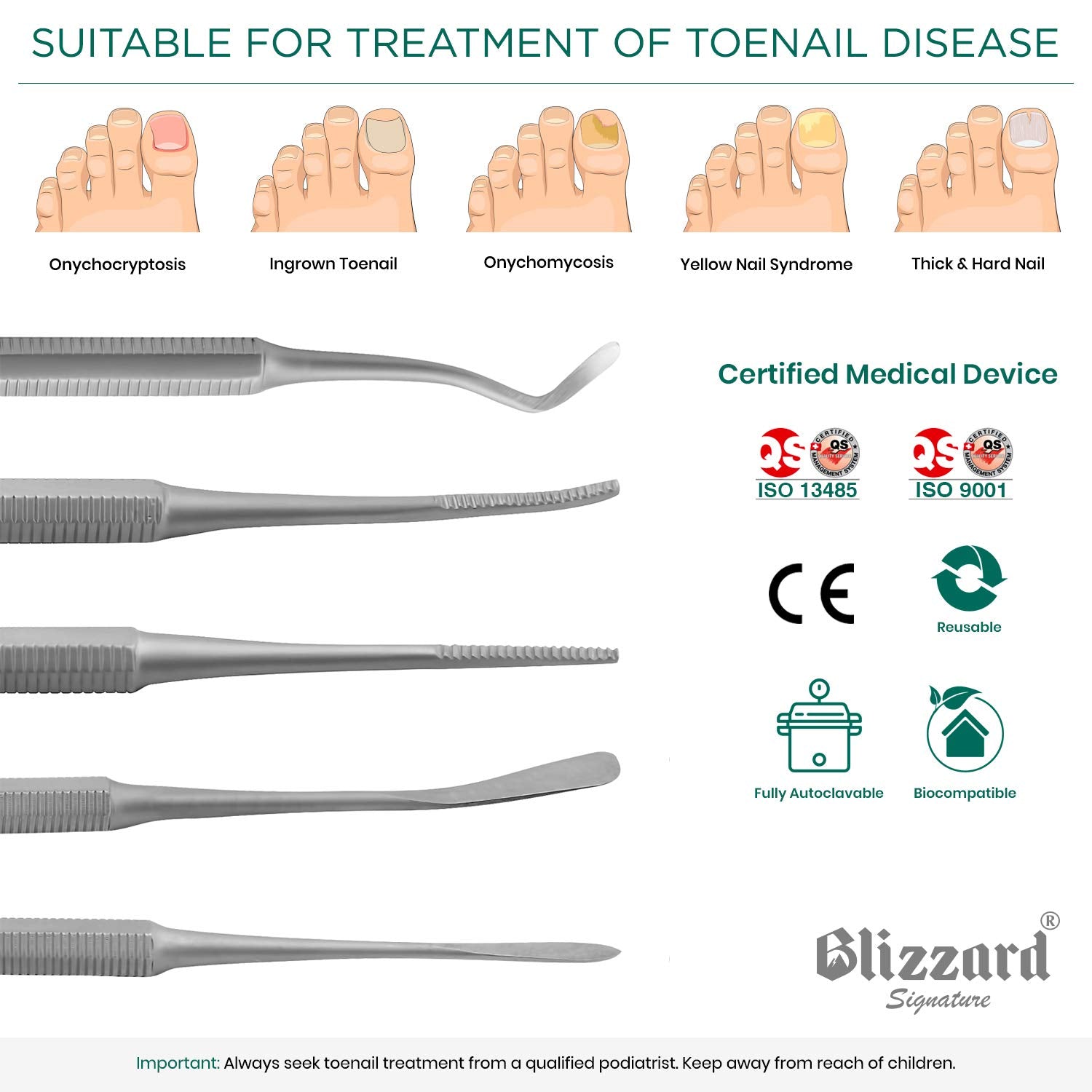• 3-piece ingrown toenail kit includes 1 x double ended nail cleaner, 1 x double-ended blacks file and 1 x double-ended nail lifter. Hospital grade medical device: our reusable, fully autoclavable ingrown toenail set is built from premium German steel to the highest quality standards; ISO 13485, ISO 9001 and CE certified.