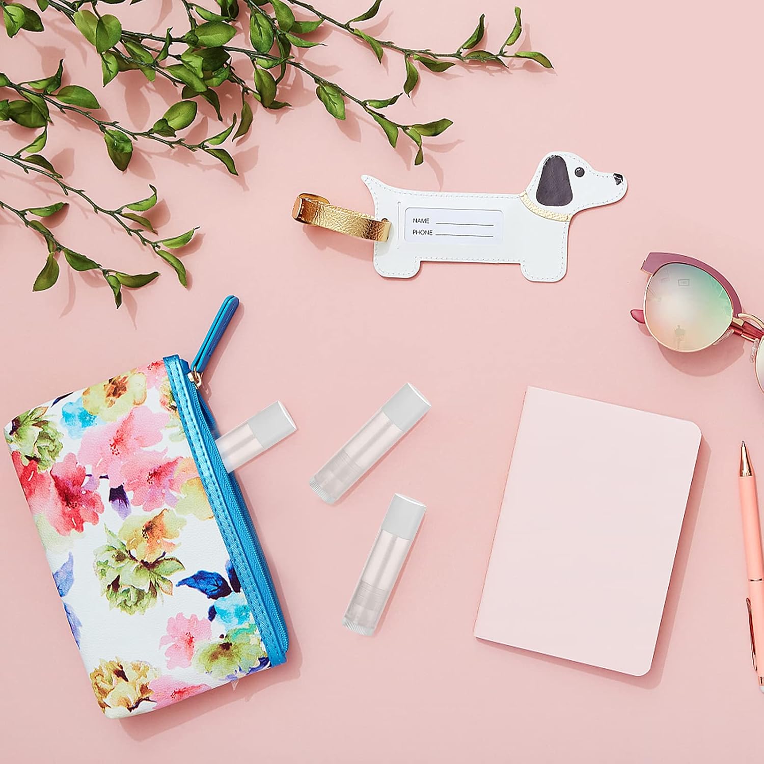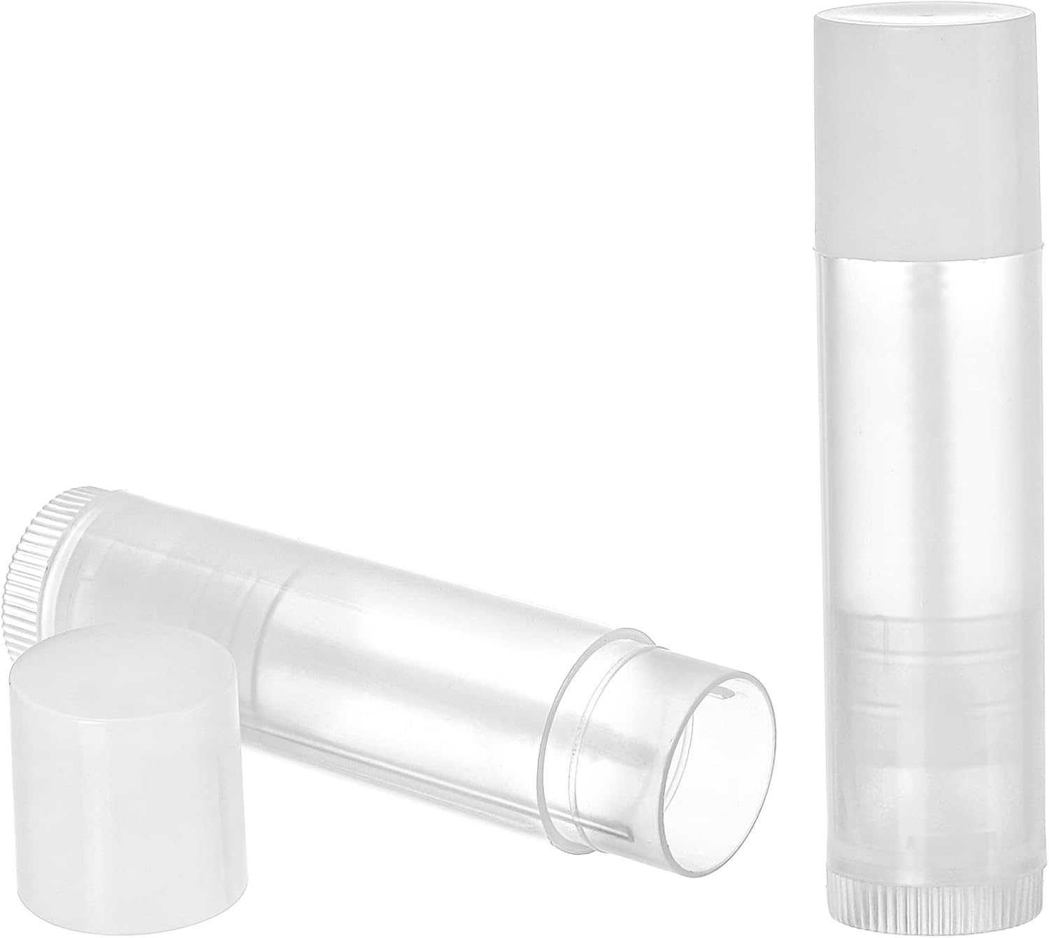 • Bekith 100 pack 5.5ml empty lip balm tubes with white snap-on caps.