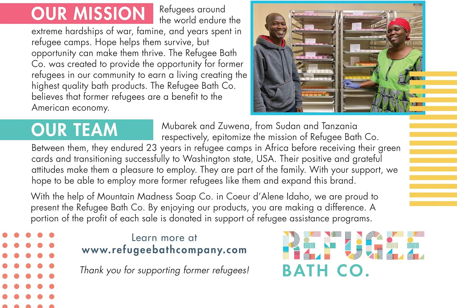 • REFUGEE ASSISTANCE DONATIONS: We believe that refugees are a benefit to our community. We created the REFUGEE BATH CO. to promote this belief by providing employment to refugees in our community. Your set of bath bombs was created by a refugee who spent a good portion of his/her life in a refugee camp before coming to the USA legally. A portion of the profit will be donated to refugee assistance programs.