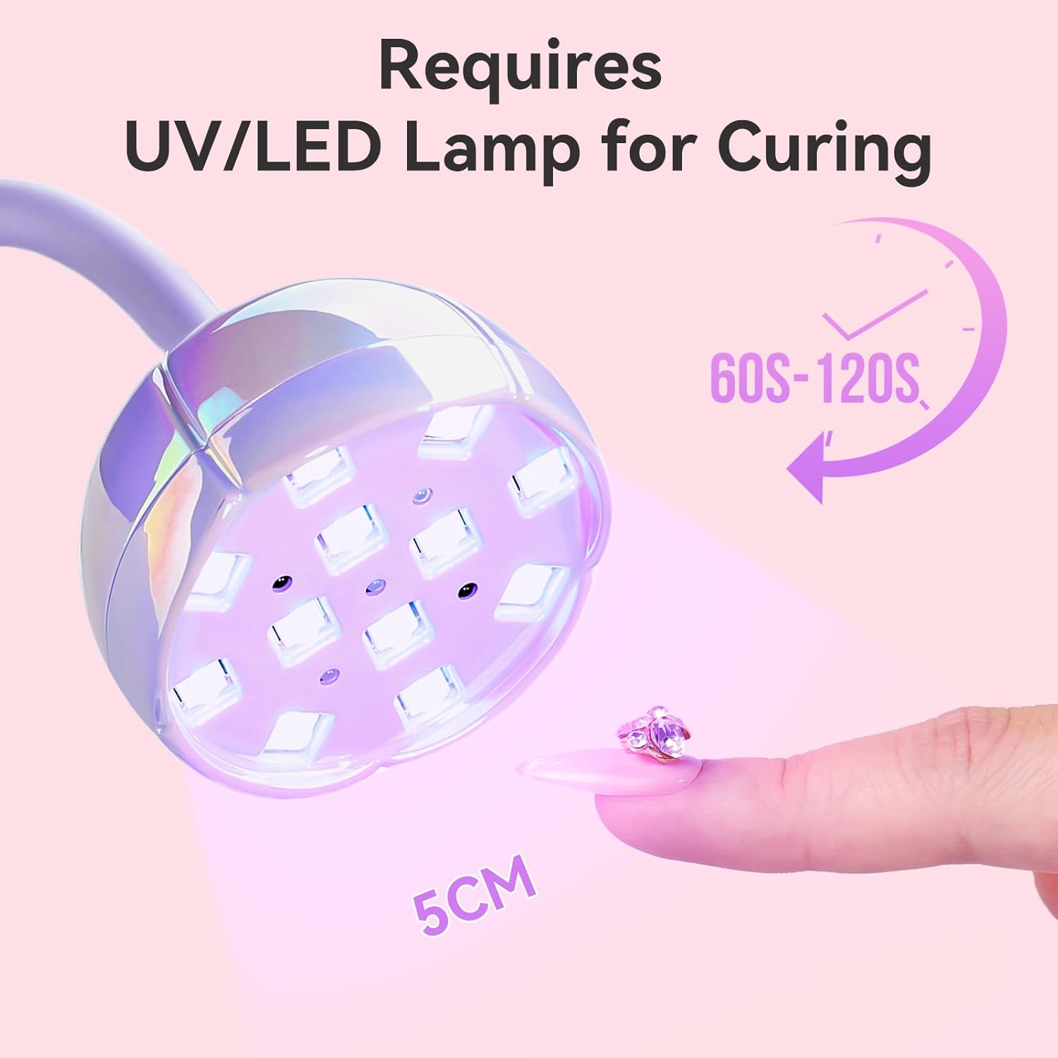 • How to Use: 1. Apply the nail crystal glue resin on the nail, 2. Put the rhinestones on, cure it for about 3 minutes(LED Lamp Requried), the time may differ for different lamps, just make sure to cure it till its completely dry, 3. For large or non-flatback rhinestones, fill a little more glue into the gap and the base to make sure its double secured, cure it with nail lamp again till its completely dry, your charms for nails are secured
